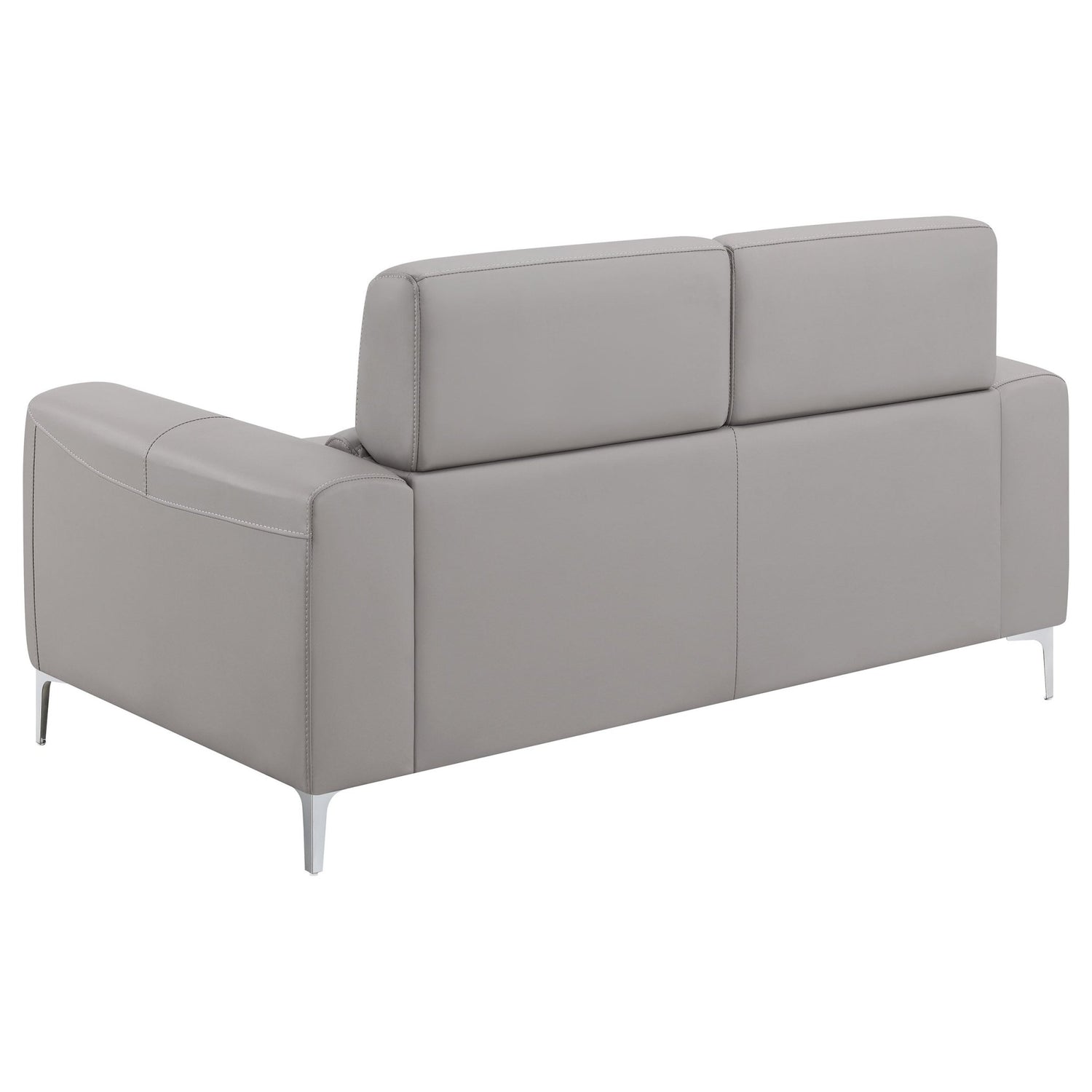Cada uno tapizado en suave polipiel color topo, este conjunto de asientos es una adición impactante a una sala de estar de estilo contemporáneo. Diseñado con un toque moderno y una silueta de líneas limpias, cada mueble presenta suaves curvas en los asientos y respaldos. Además, detalles como las costuras superiores y las patas de metal plateado añaden un toque sofisticado y glamuroso. Invite a familiares e invitados a relajarse en el alto respaldo y los cojines del asiento mientras ven una película o disfrutan de un cóctel. Fabricado con una robusta estructura de madera maciza, cada pieza está diseñada para durar.