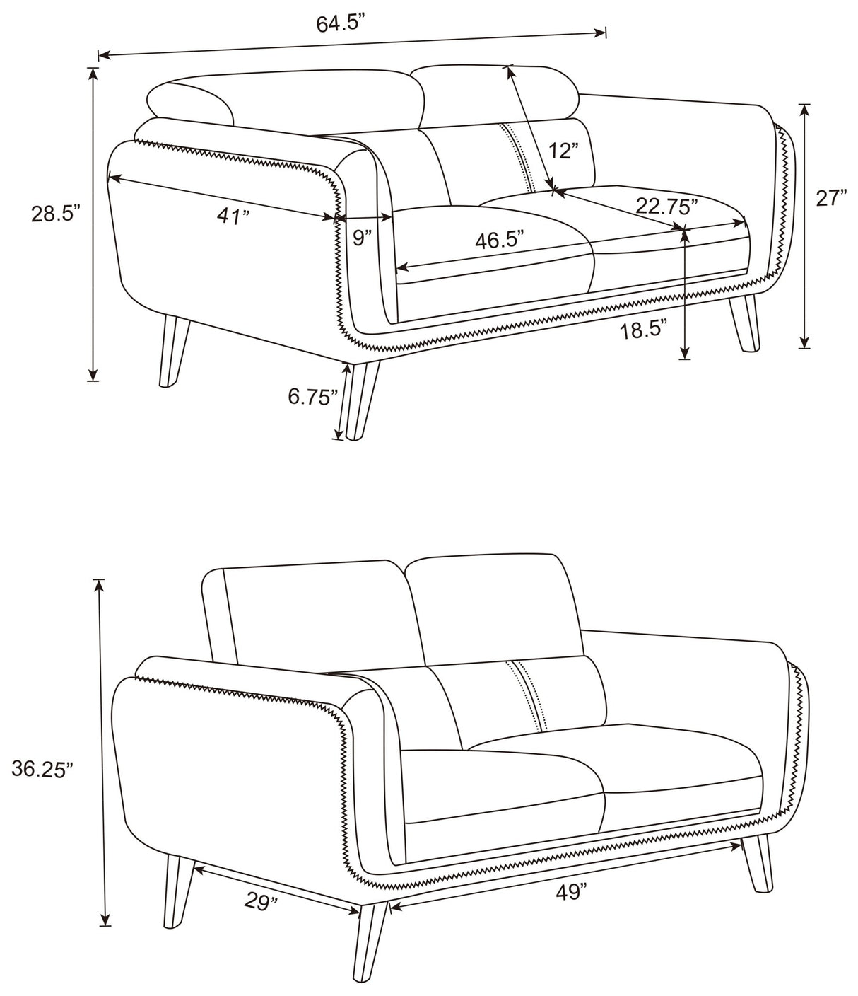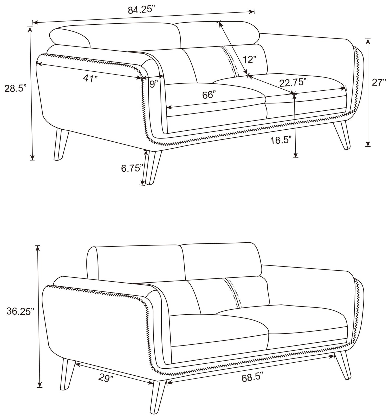 Completa tu sala de estar o área de entretenimiento con este conjunto de sofás contemporáneos de inspiración esmoquin. Relájate en los lujosos cojines del asiento, entre los brazos acolchados de doble riel, al final de un largo día. Los respaldos altos con soporte lumbar también ofrecen una cómoda forma de relajarse. Las patas cónicas y acampanadas con acabado marrón oscuro se asoman desde abajo de forma espectacular, en un guiño al diseño moderno de mediados de siglo de la estructura. Por último, el bordado de cruz y el pespunte en blanco aportan el toque final y un toque de contraste.