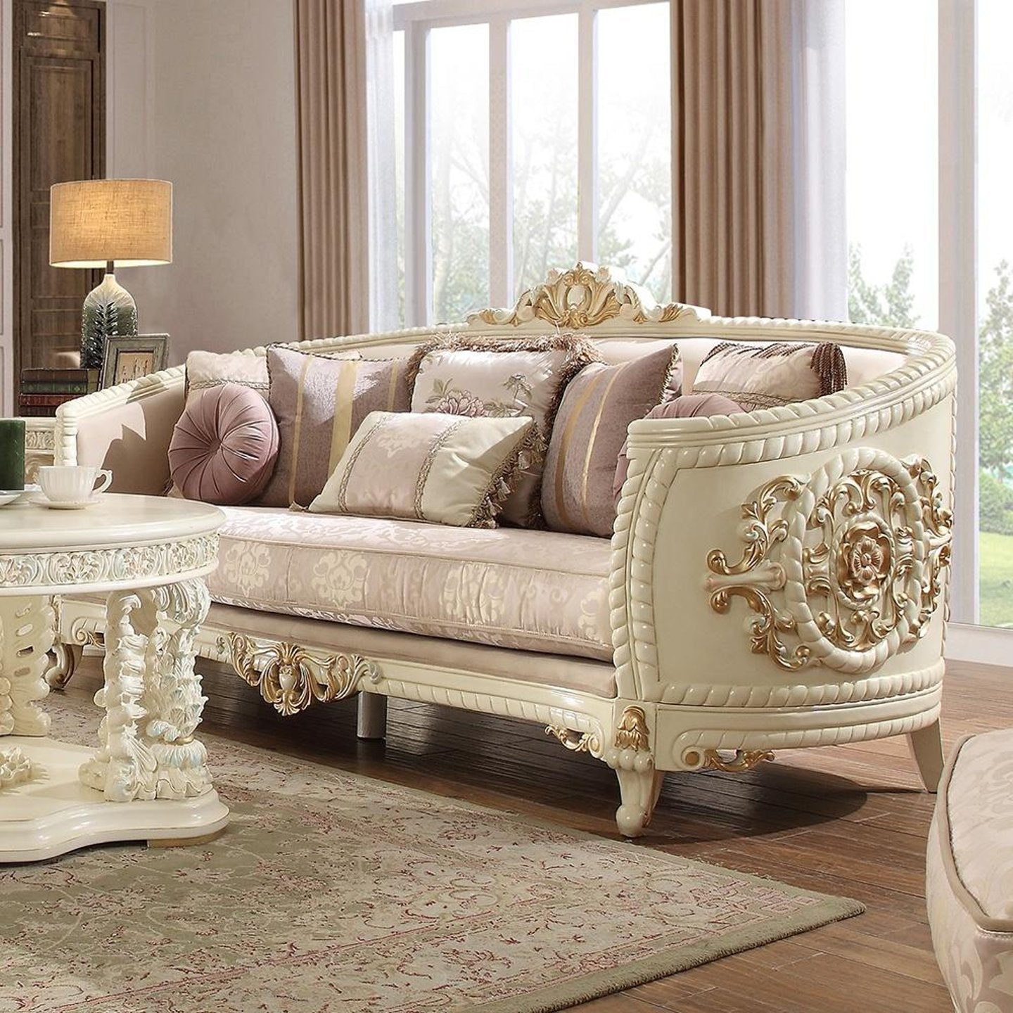 Juego de sala tradicional HD-2011 en chenilla color crema y madera tallada color hueso | Diseño hogareño