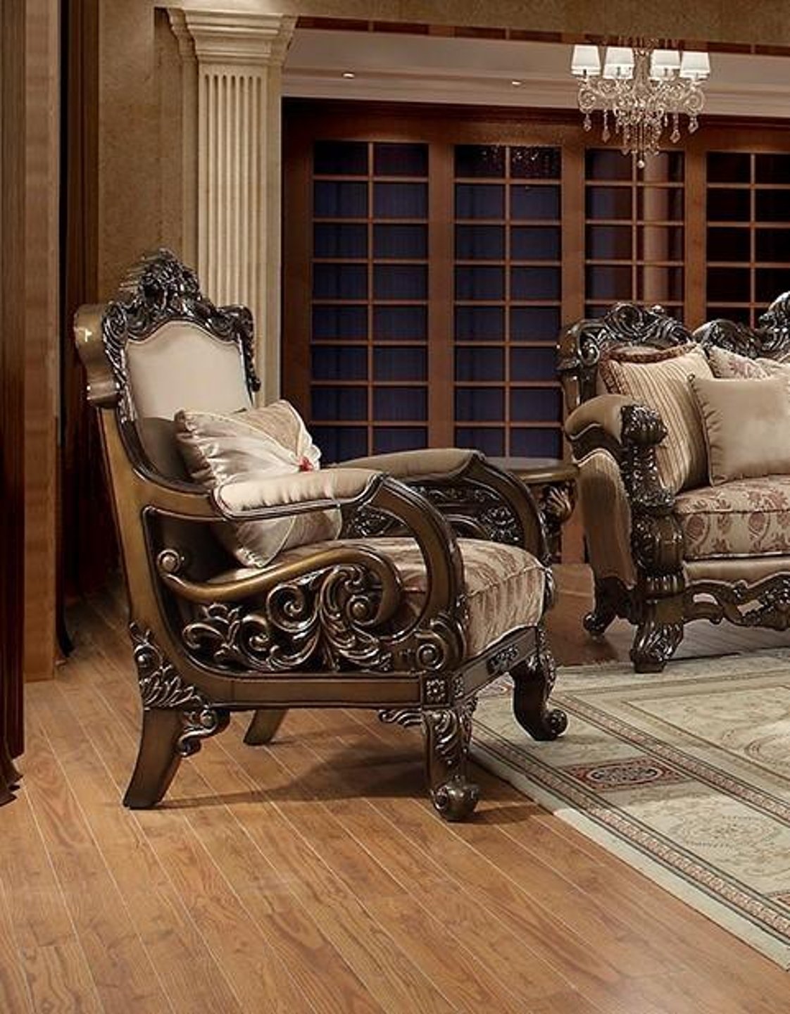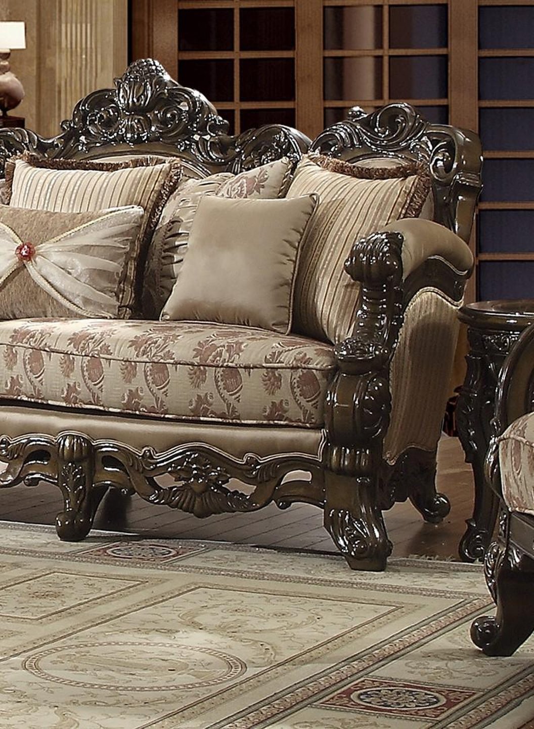 Juego de sala tradicional de madera tallada Hd-2658 con acabado cerezo marrón | Diseño hogareño