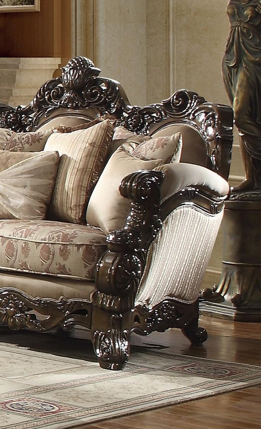 Juego de sofás Homey Design HD-2658 con acabado tradicional en cerezo marrón. Presenta la brillantez del estilo tradicional, fusionada con el estilo clásico europeo, justo en el centro de tu hogar. Esta colección está tapizada con tela europea de lujo y detalles de madera en acabado cerezo. El juego de sofás se complementa con un elegante cojín decorativo, como se muestra.
