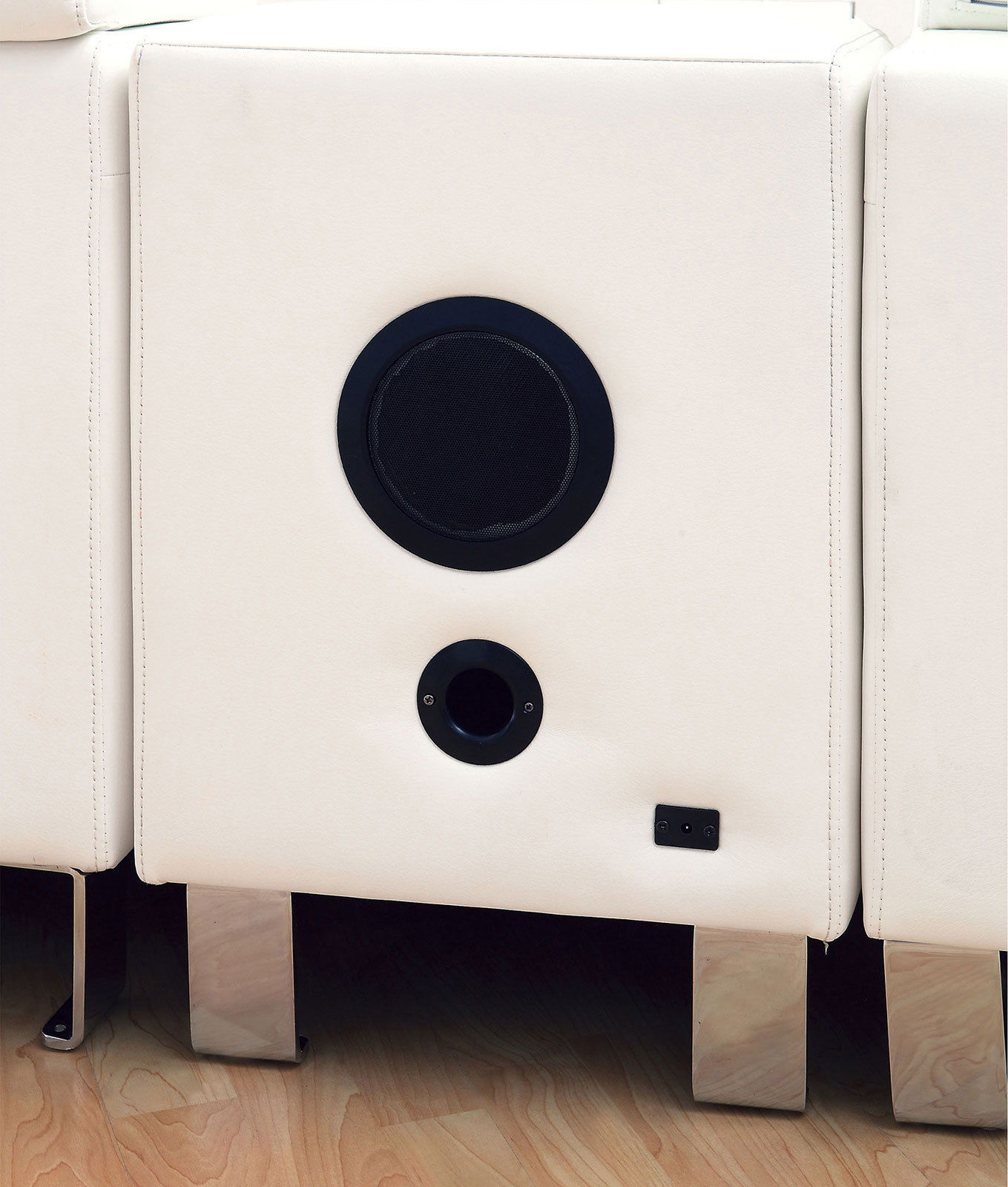 Único por su forma contemporánea, este sofá modular cuenta con reposacabezas y reposabrazos plegables y una consola con altavoces opcional que permite la reproducción inalámbrica de música. Disponible en cuero regenerado blanco o negro a juego.
