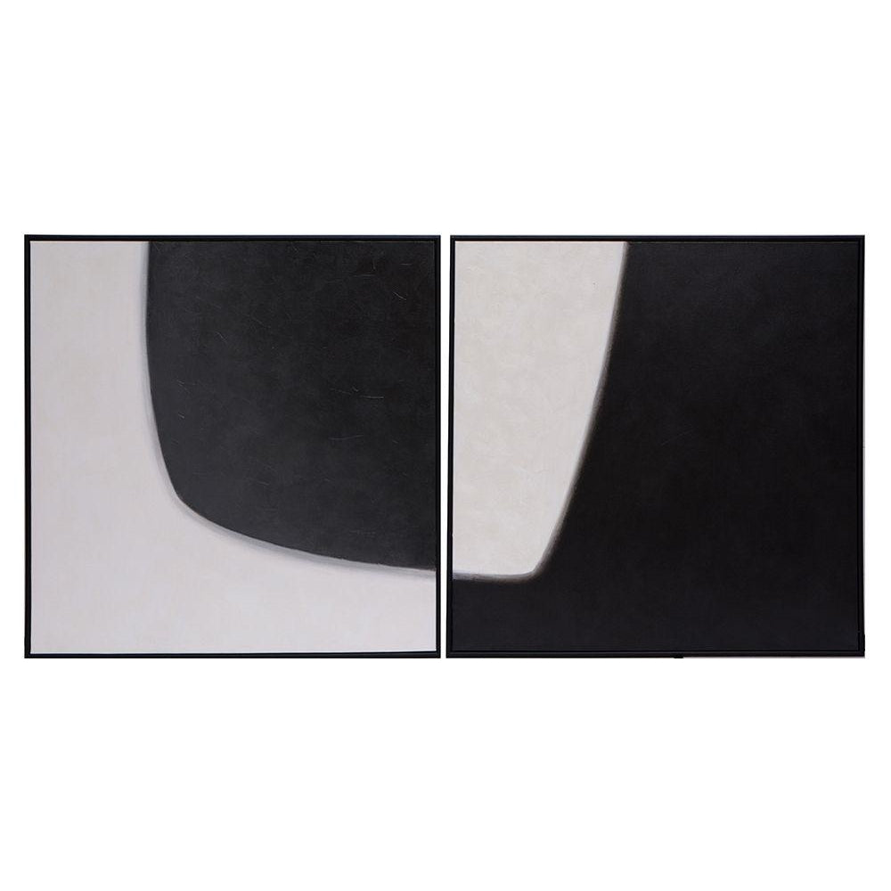 Este llamativo díptico en blanco y negro presenta figuras abstractas modernas. Un complemento perfecto para espacios contemporáneos. Presenta marcos flotantes de madera con acabado negro.