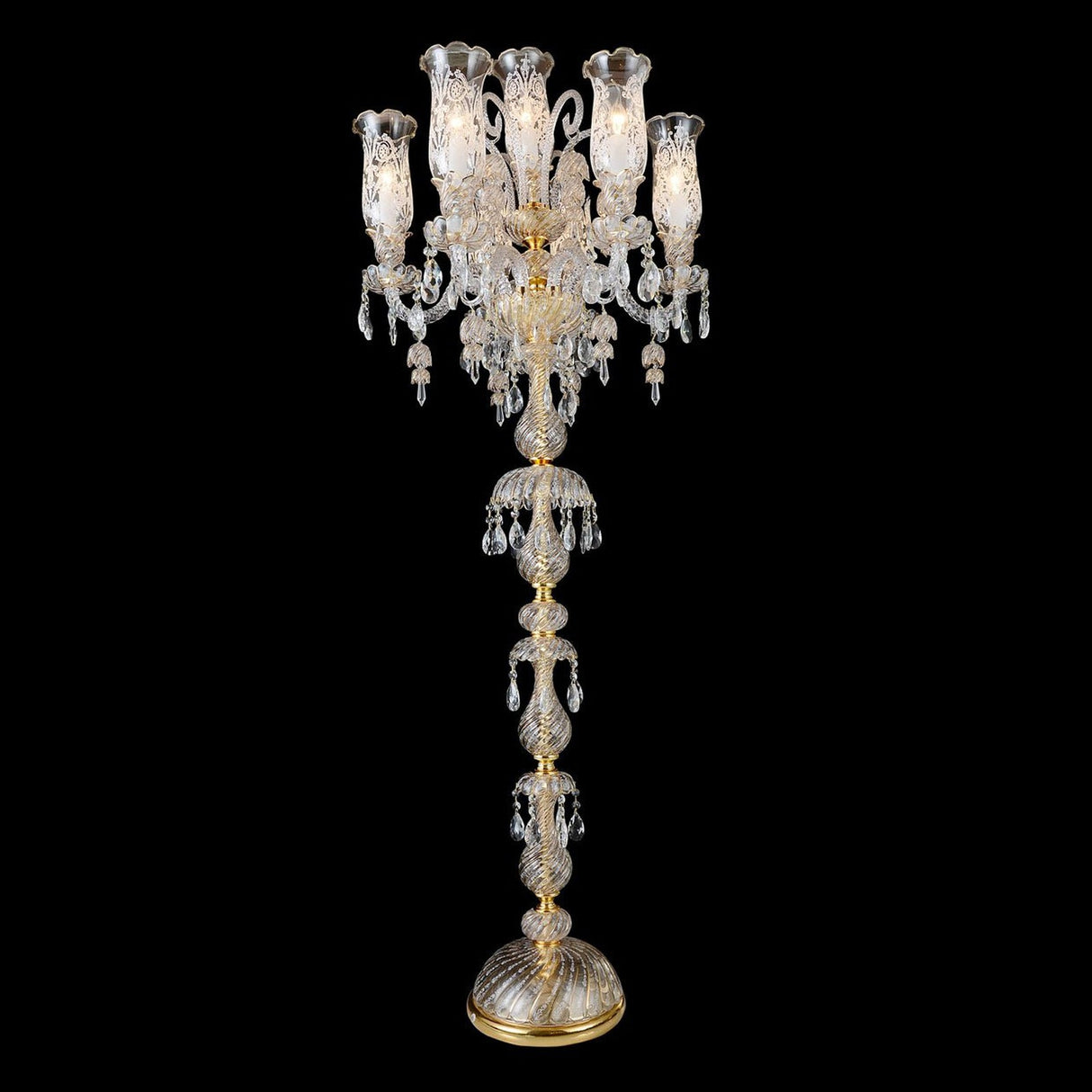 Toda la elegancia y el glamour de una lámpara de araña presentada en una majestuosa lámpara de pie. 7 exquisitas lámparas de vidrio grabado están orgullosamente adornadas con detalles de vidrio, acrílico y cristal; disfrutando de un acabado dorado luminoso.