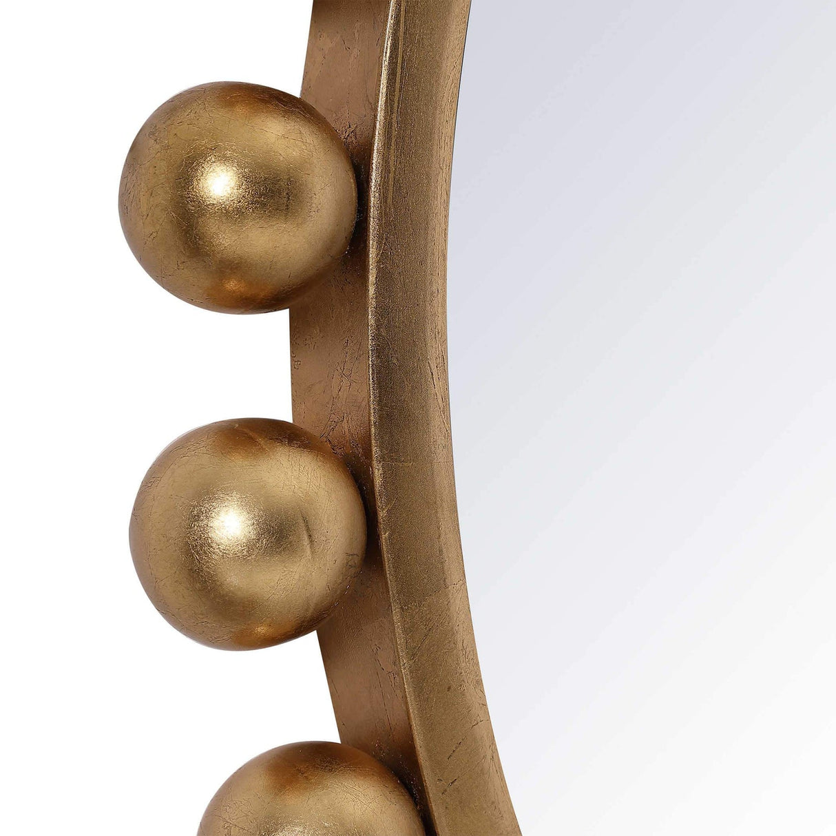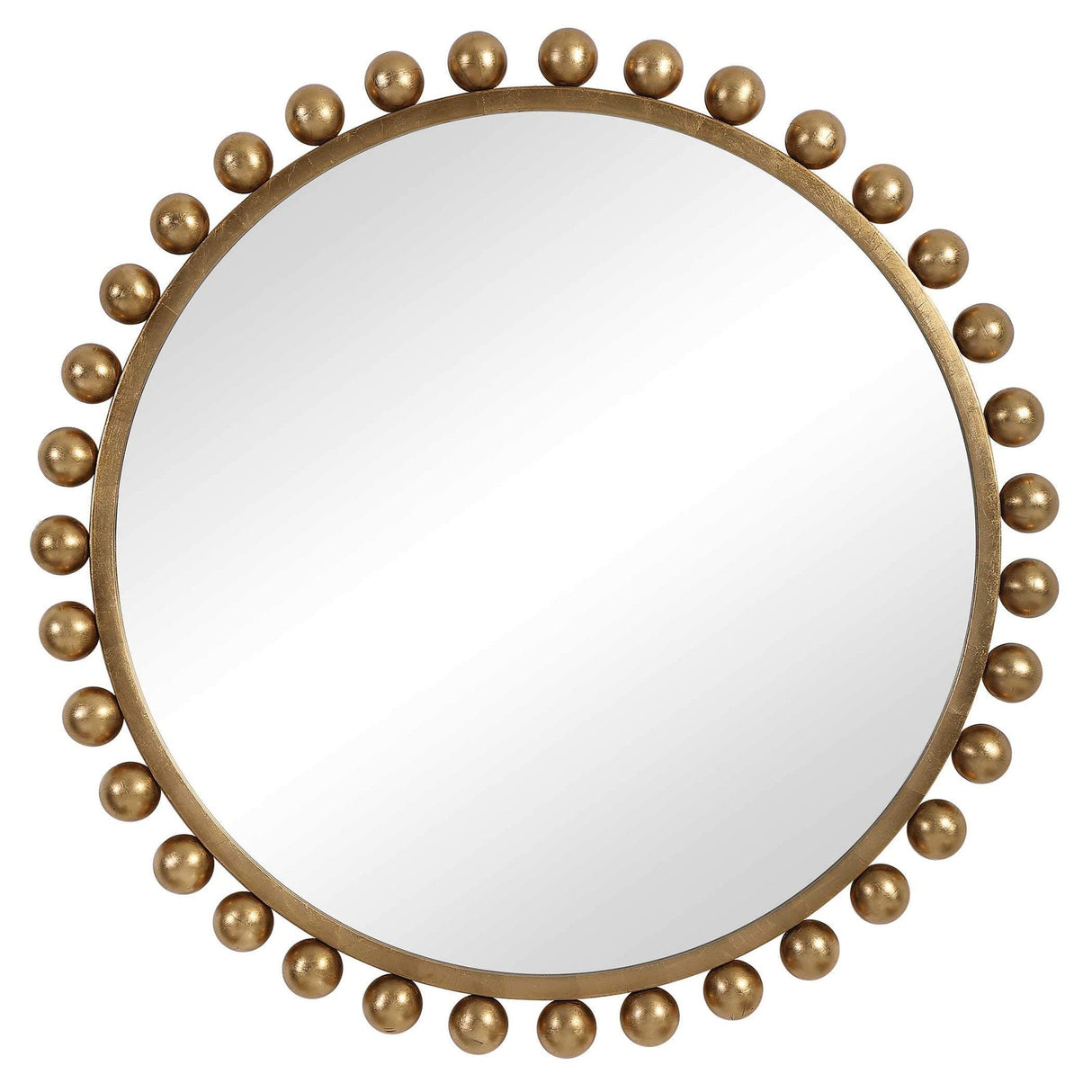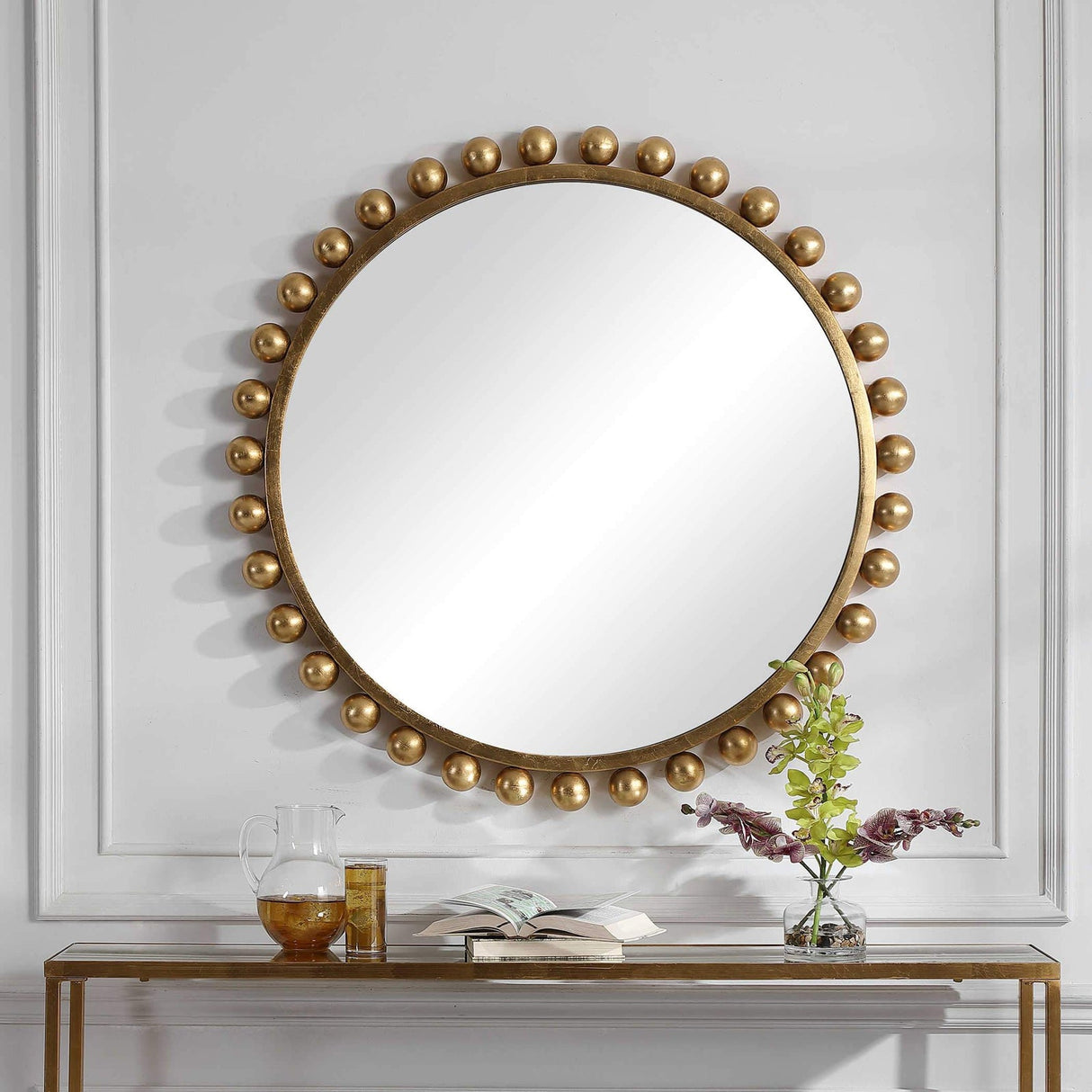 - Este llamativo espejo redondo añade un aspecto lujoso y un estilo sofisticado a cualquier habitación al mostrar esferas de hierro liso que embellecen