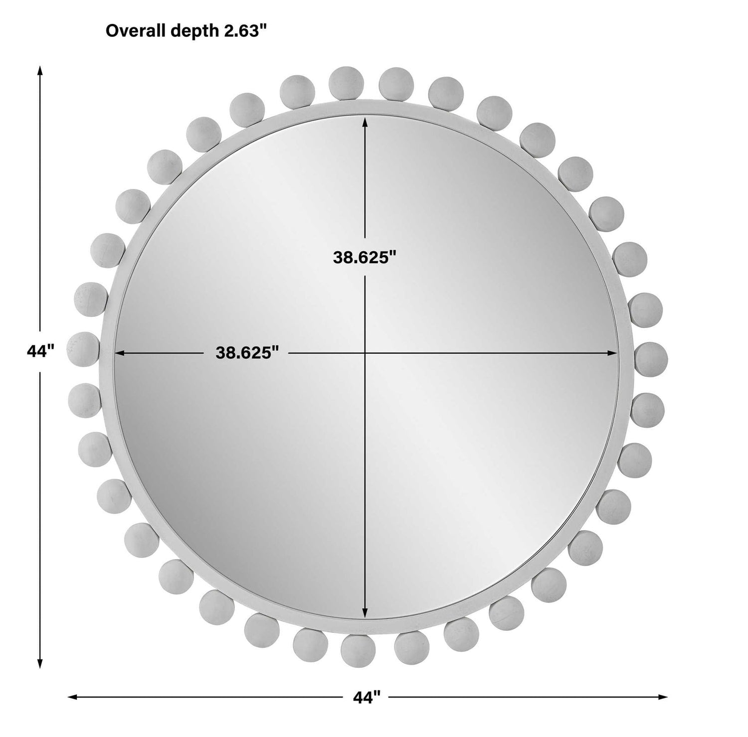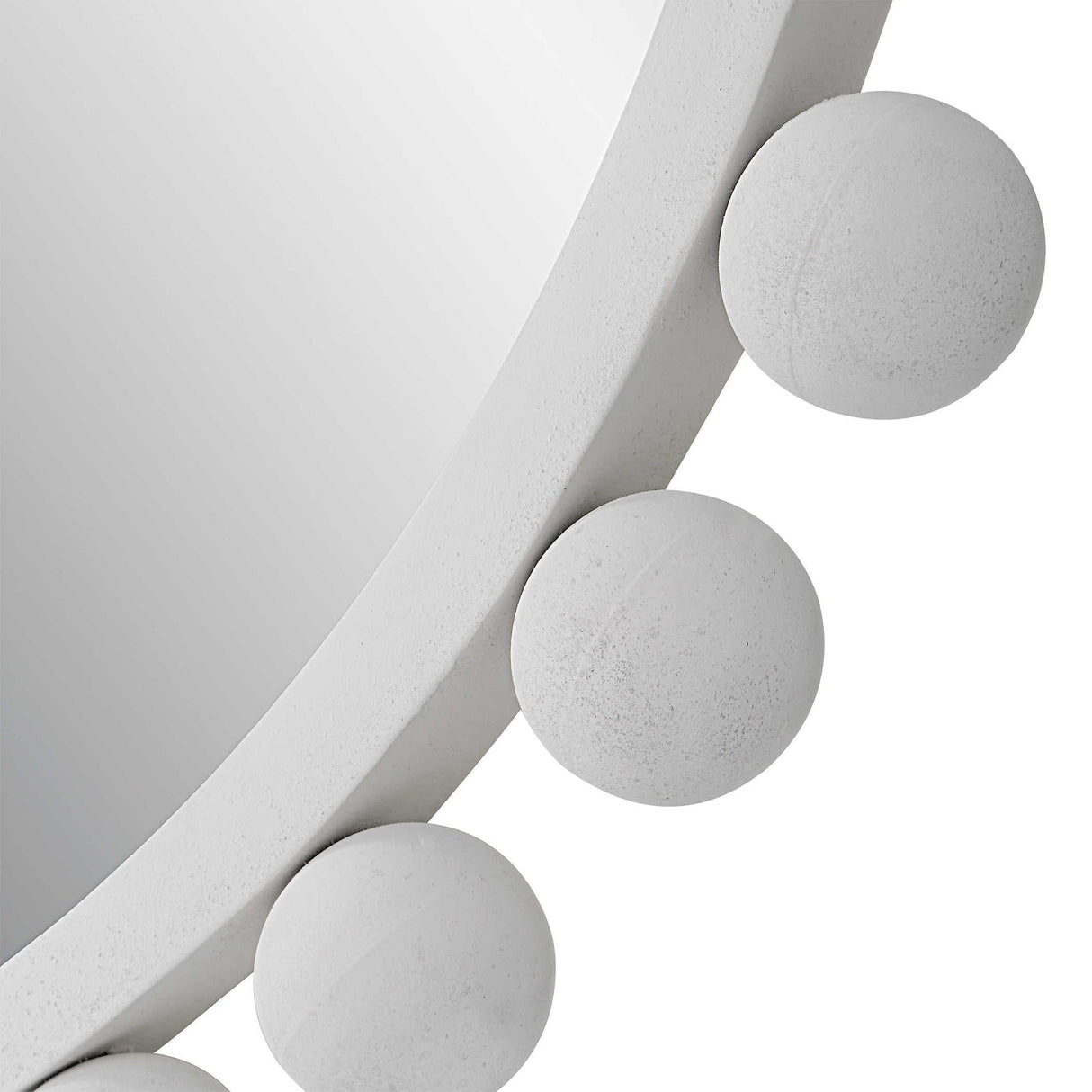 - Este llamativo espejo redondo agrega una apariencia lujosa y un estilo sofisticado a cualquier habitación al mostrar esferas de hierro suaves que embellecen un marco interior elegante, acabado en un blanco mate limpio.