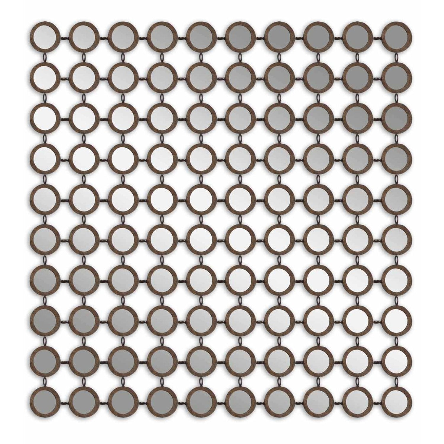 - Numerosos espejos redondos pequeños se unen mediante metal forjado a mano para crear este espejo.