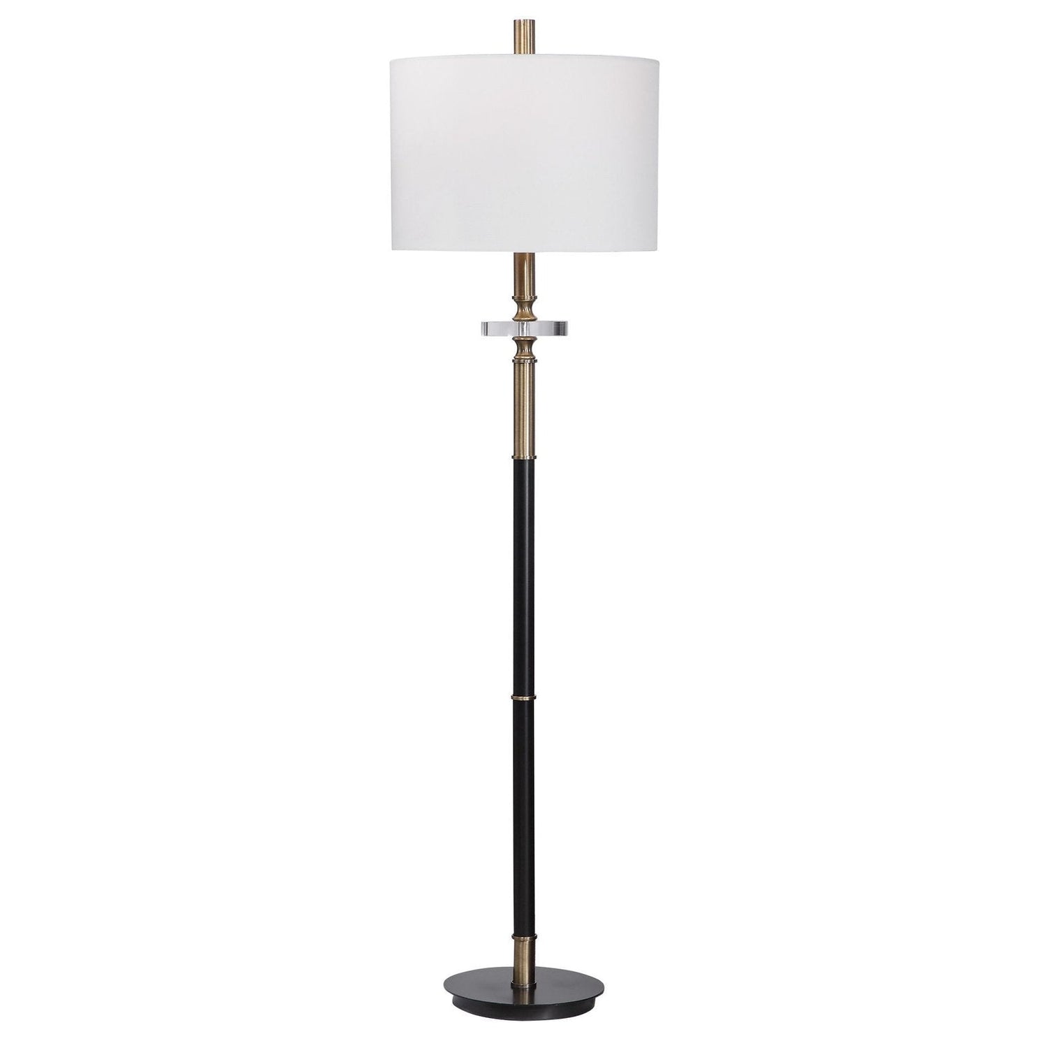 - La elegancia tradicional se exhibe en esta lámpara de pie, con acabado en negro envejecido con detalles en latón antiguo y un adorno de cristal grueso.