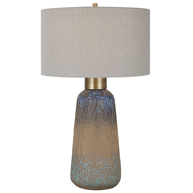 - Una hermosa exhibición de color y estilo, esta lámpara de mesa de cerámica presenta un diseño en relieve con una combinación única de esmaltes mate y brillante en varios tonos de azul verdoso, índigo y óxido dorado, combinados con detalles chapados en latón antiguo.