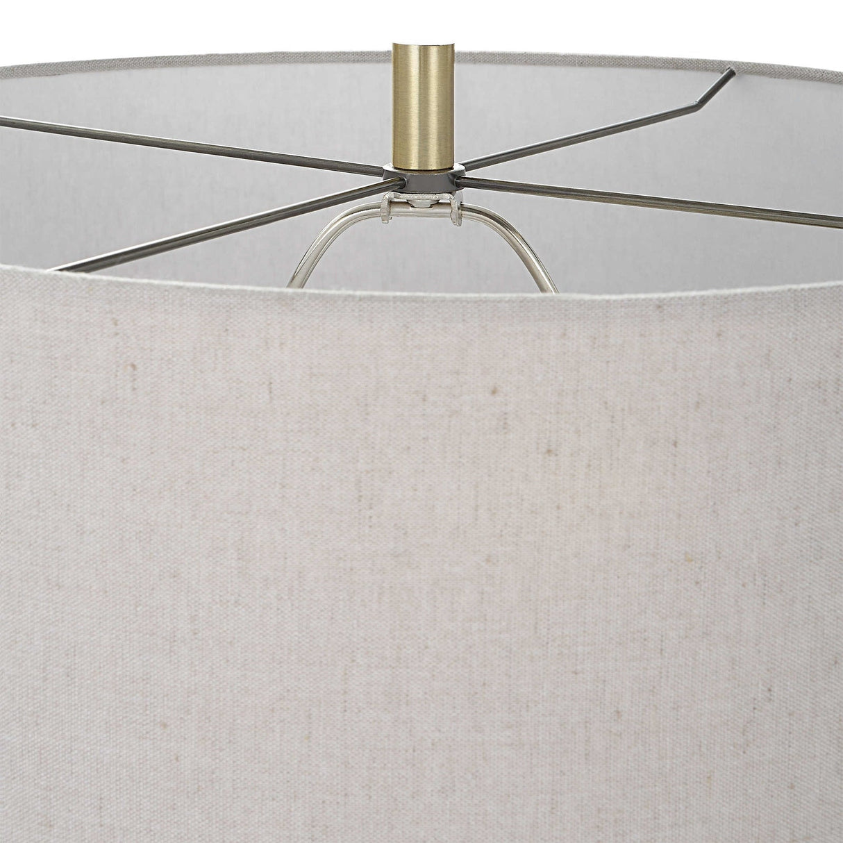 - La pantalla del tambor de tapa dura está cubierta con una tela de lino gris claro con vetas naturales.