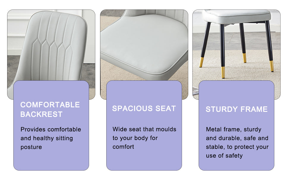 - Sillas de PU sin brazos: Las cuatro sillas de comedor están hechas de material de PU de alta calidad con un diseño sin reposabrazos, simple pero elegante, y el patrón de rayas verticales en el respaldo agrega comodidad adicional para los usuarios. Patas de silla de metal: Cada silla está equipada con patas de metal negro, que se hacen eco de las patas de la mesa, creando una apariencia armoniosa con un color y material unificados.