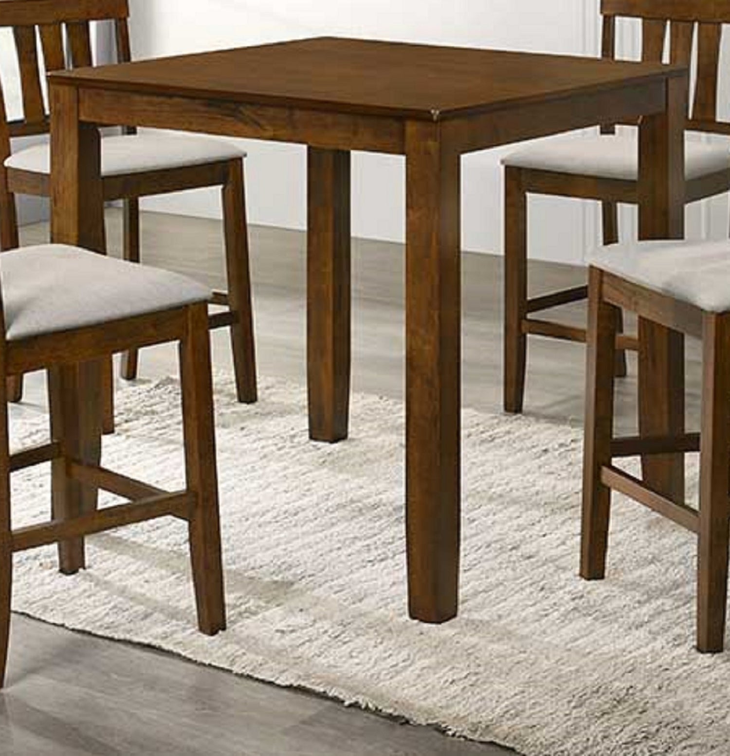 Hermoso juego de comedor de 5 piezas en color cereza con altura de mostrador, mesa de comedor cuadrada con altura de pub y sillas tapizadas en color crema, juego de comedor de madera
