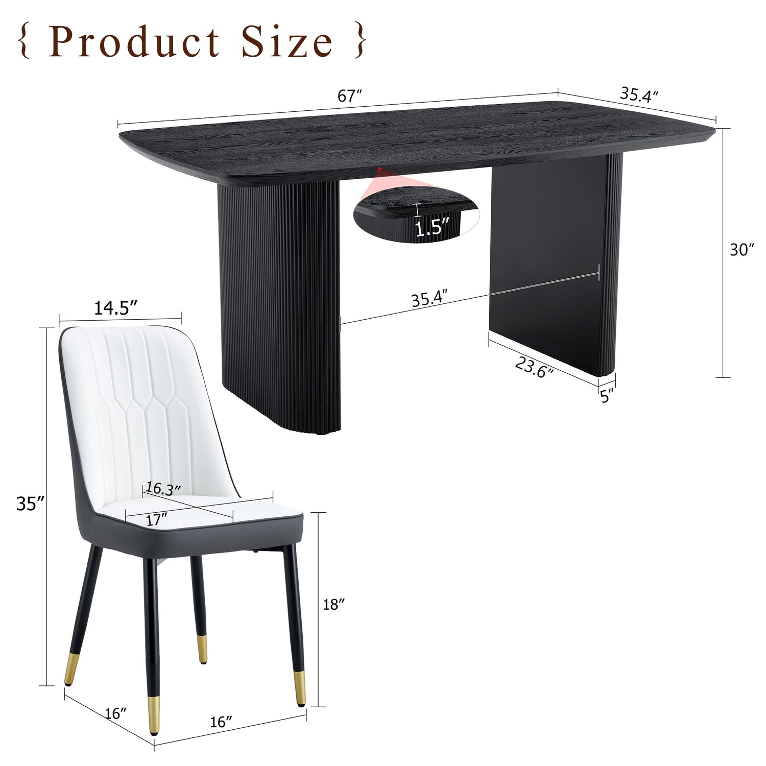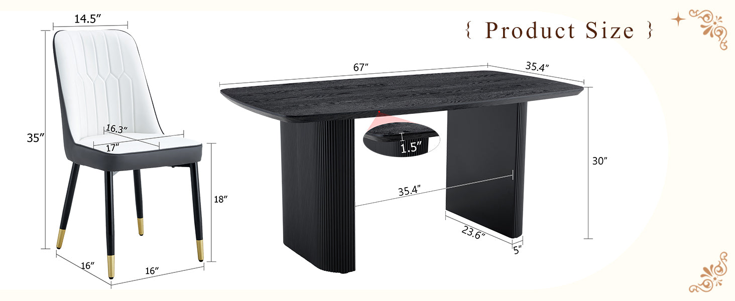 Juego de mesa y sillas. Mesa de comedor de MDF con veta de madera negra de 67 x 35,4 pulgadas: una opción simple, lujosa y estable. Combina con 4 sillas de color blanco y gris oscuro empalmadas con cojines de PU y patas de metal negro. está agotado y se enviará tan pronto como vuelva a estar disponible.