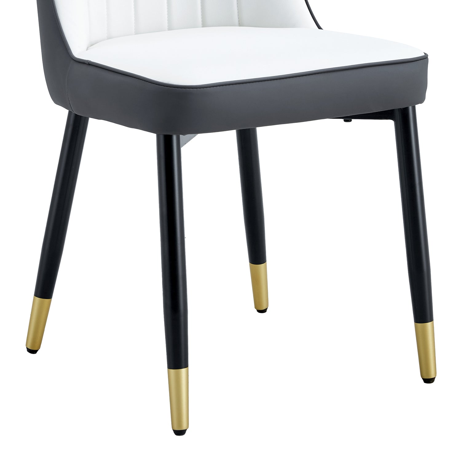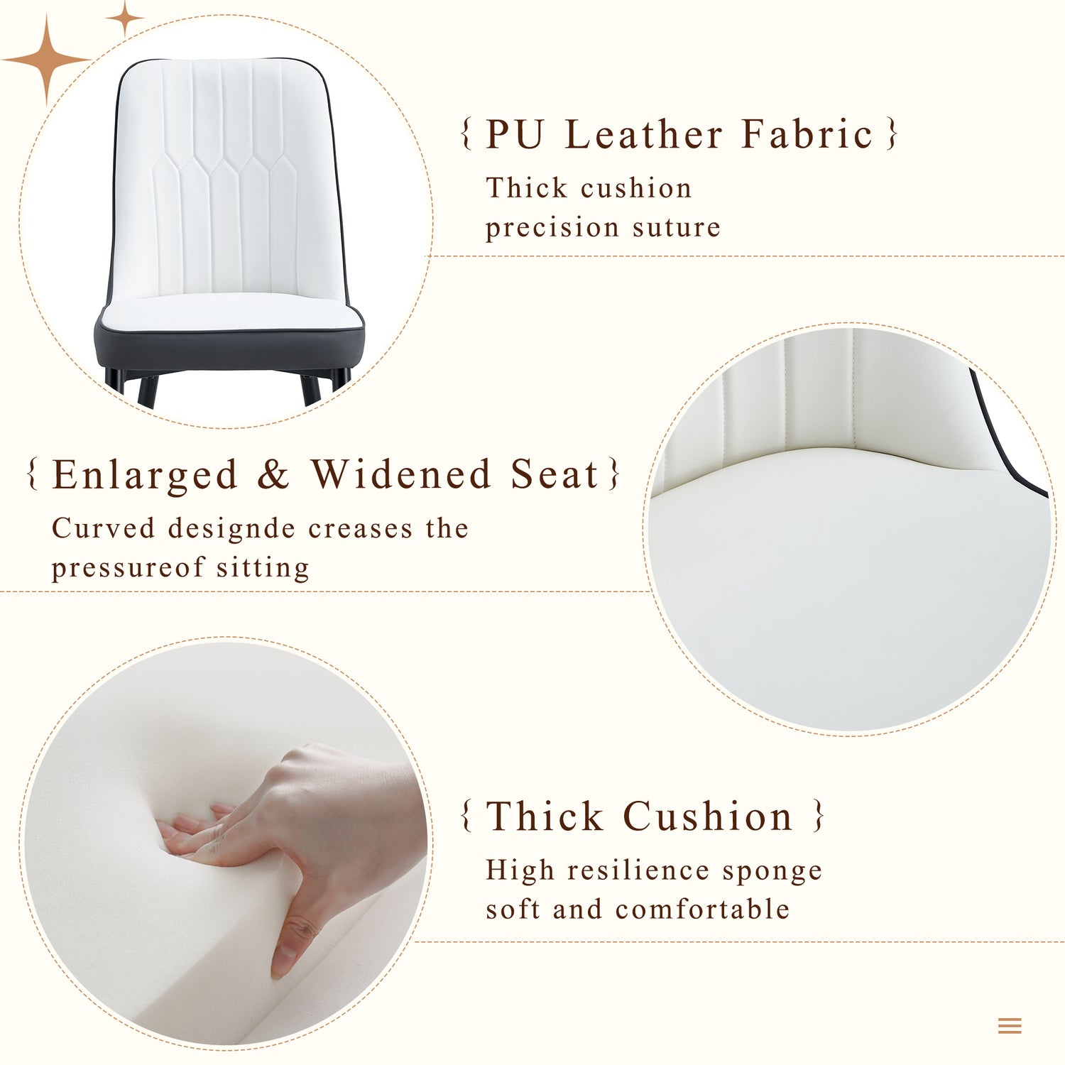 - Decoración en aerosol dorado: la parte inferior de las patas de la silla cerca del suelo está decorada con aerosol dorado, lo que agrega un toque de lujo al diseño.Patas de piso antideslizantes: teniendo en cuenta la seguridad y la estabilidad de uso, la parte inferior de las patas de la silla está especialmente equipada con patas de piso antideslizantes, protegiendo el piso y asegurando la estabilidad de las sillas de comedor durante el uso.