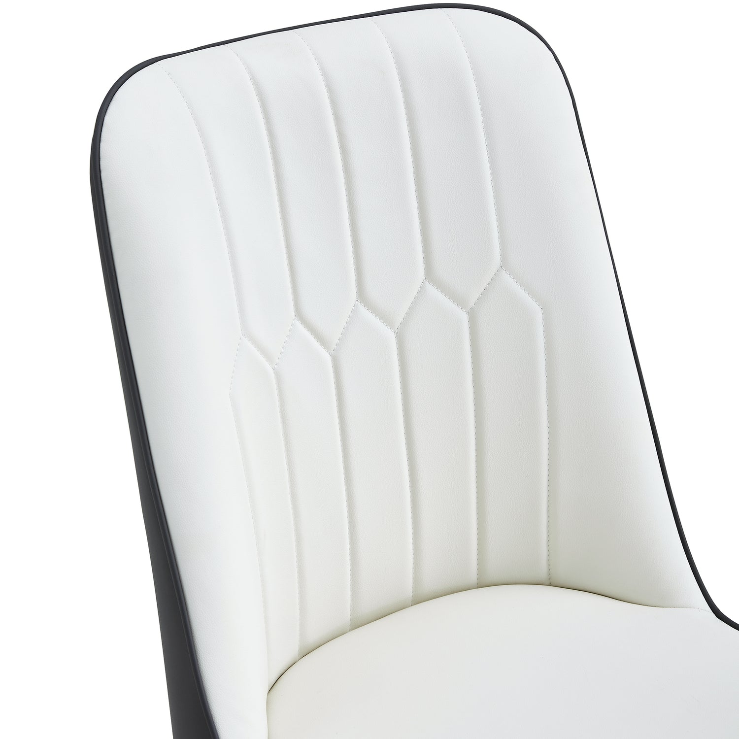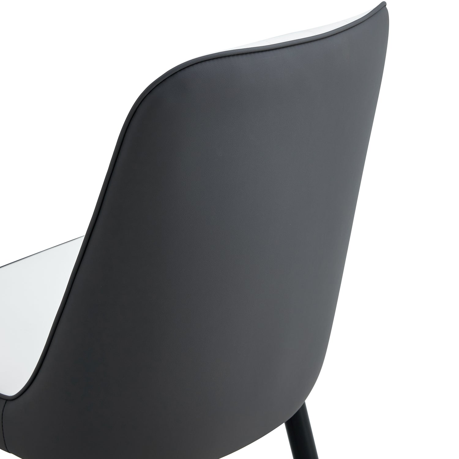 - Las sillas que acompañan están diseñadas en colores empalmados blanco y gris oscuro, con patas de silla de metal negro, simples pero lujosas. Las sillas están rellenas de esponja para una experiencia de asiento suave y cómoda. Las sillas están diseñadas de acuerdo con la ergonomía, proporcionando una postura para sentarse más cómoda, con diseños de líneas simples en el respaldo.