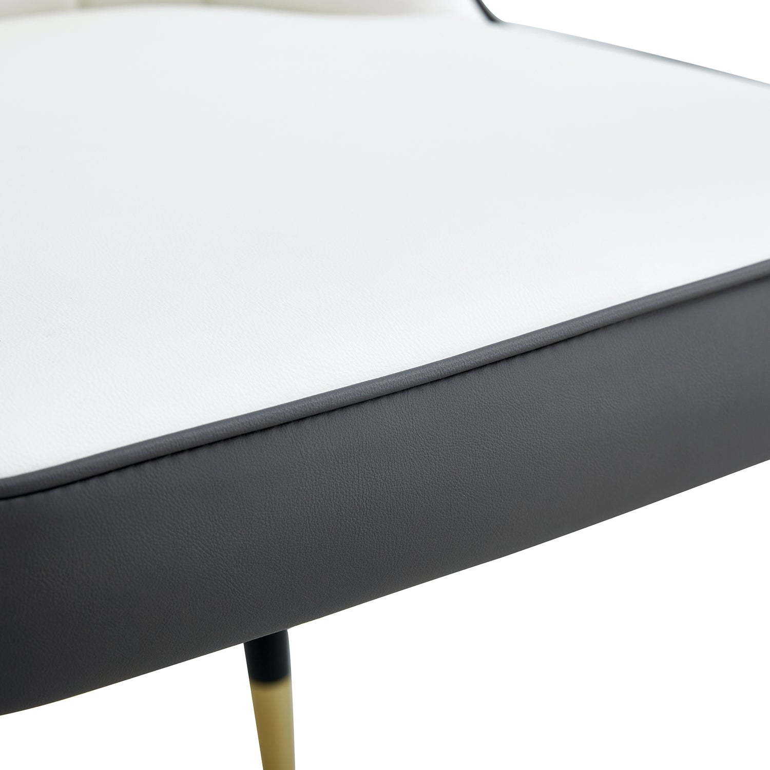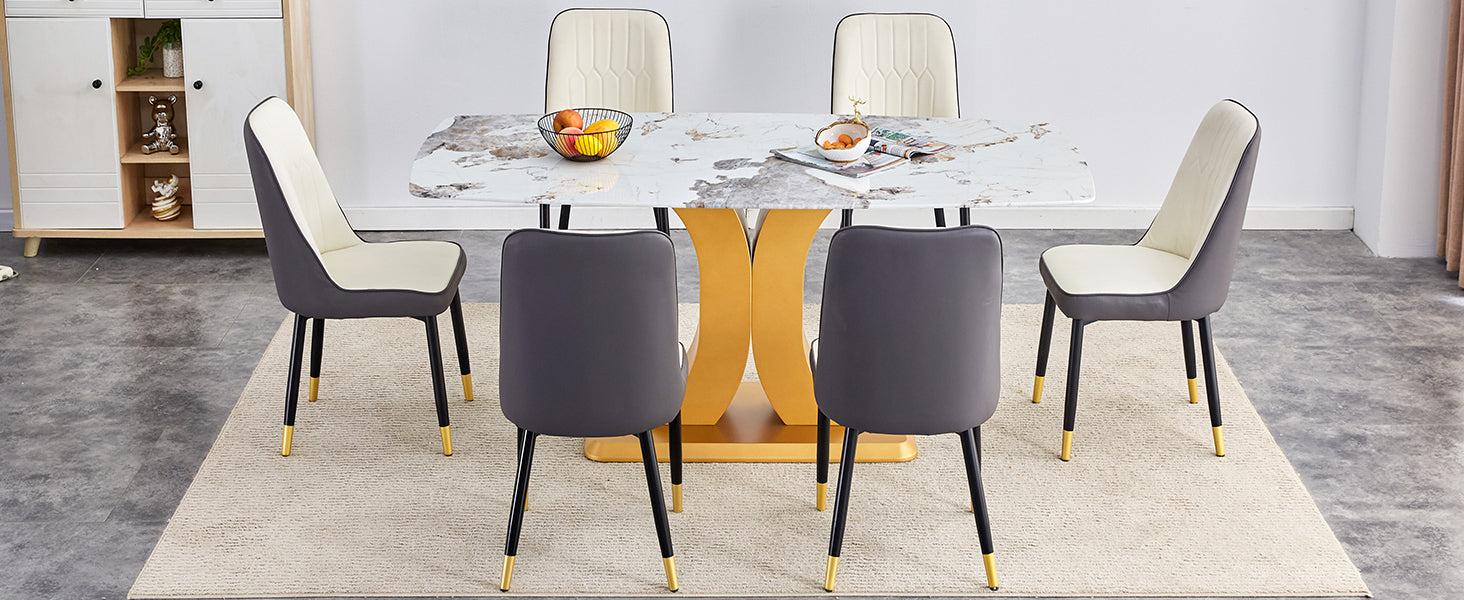 Juego de mesa y sillas. 71'x35.4'x30' Lujosa mesa de comedor de vidrio con diseño Pandora y patas de MDF en forma de C doradas adosadas. Combinada con 6 sillas de PU de color blanco y gris oscuro empalmadas.