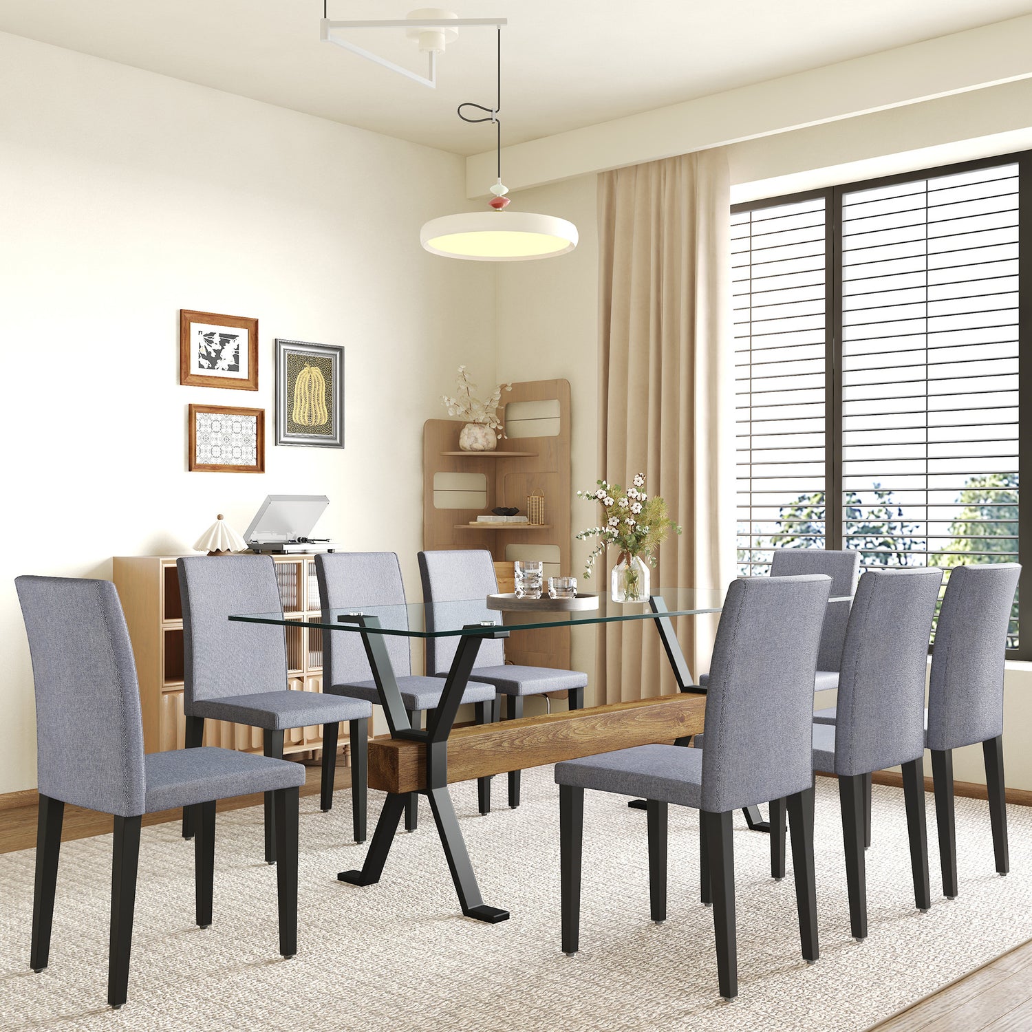 Juego de mesa y sillas. Tablero de vidrio templado de 79'x31.5' pulgadas con patas de mesa de metal negro en forma de X, viga transversal de MDF con textura de veta de madera. Combina con 8 sillas de comedor de lino y algodón gris claro.