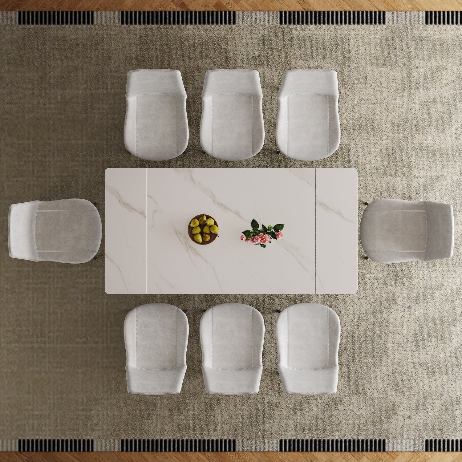 Juego de mesa de comedor moderna retráctil de piedra sinterizada con patas de acero al carbono negro, incluye 8 sillas.