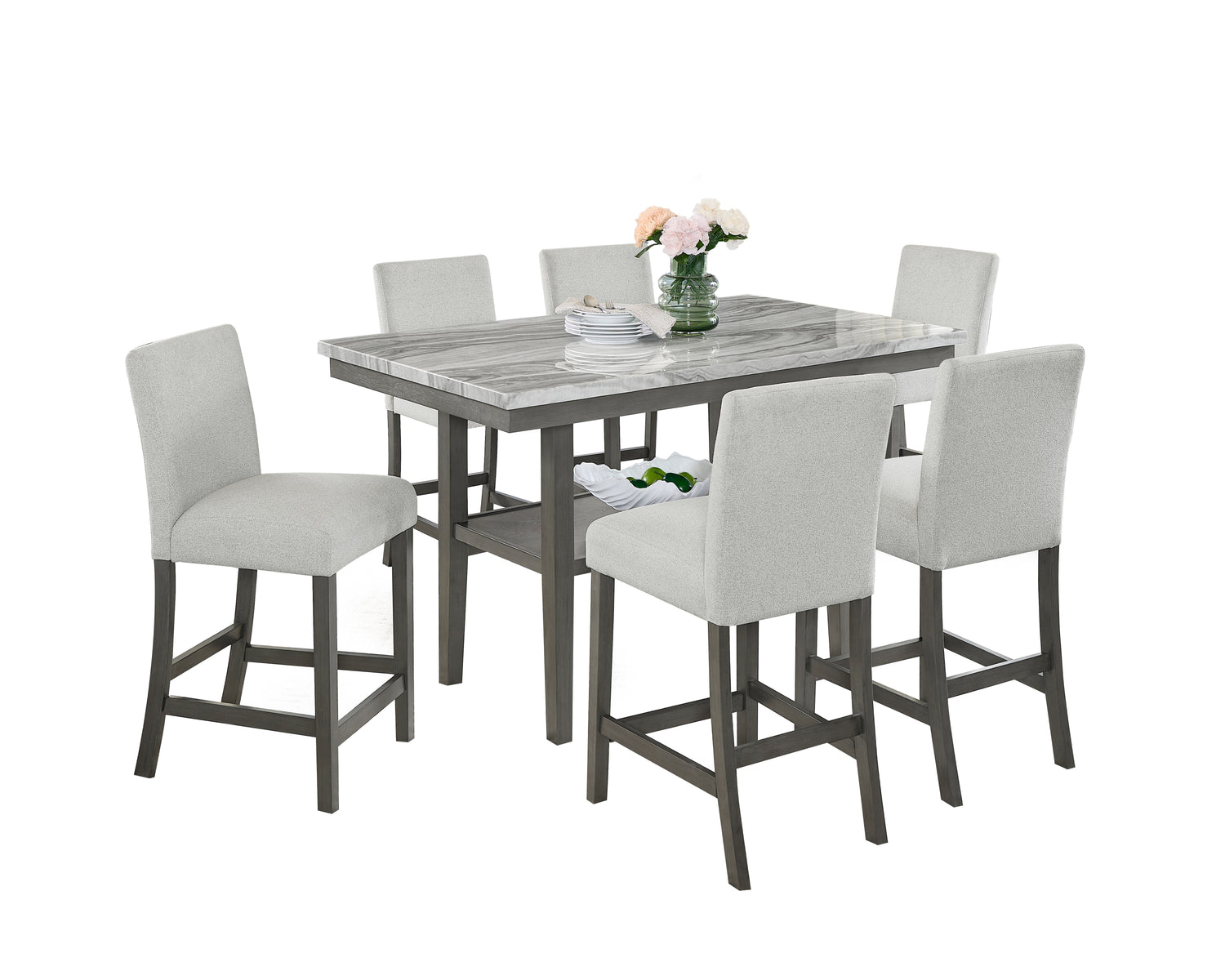 Juego de comedor Selena de 7 piezas de 182 cm de altura con imitación de mármol gris, estante de almacenamiento y sillas tapizadas en gris claro.