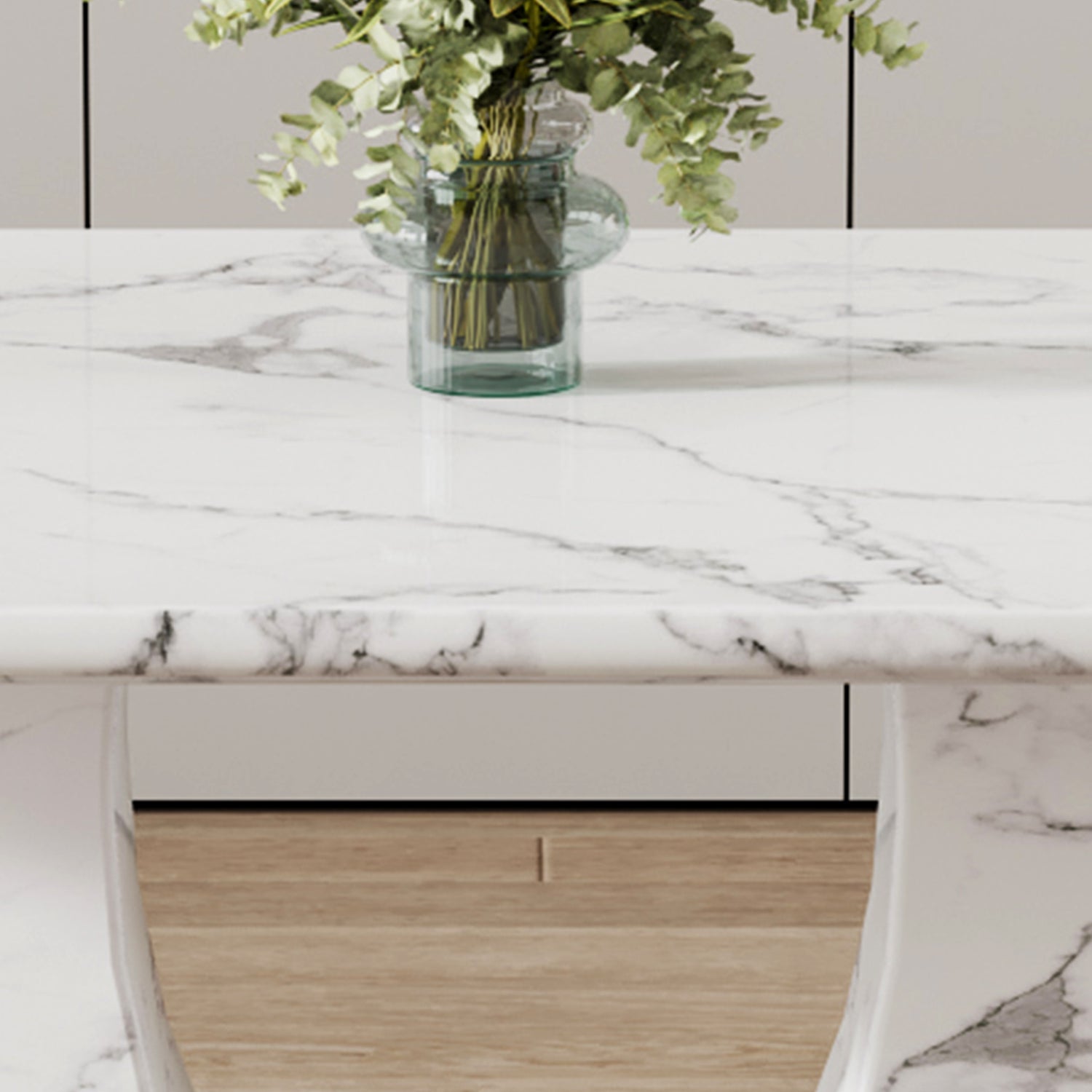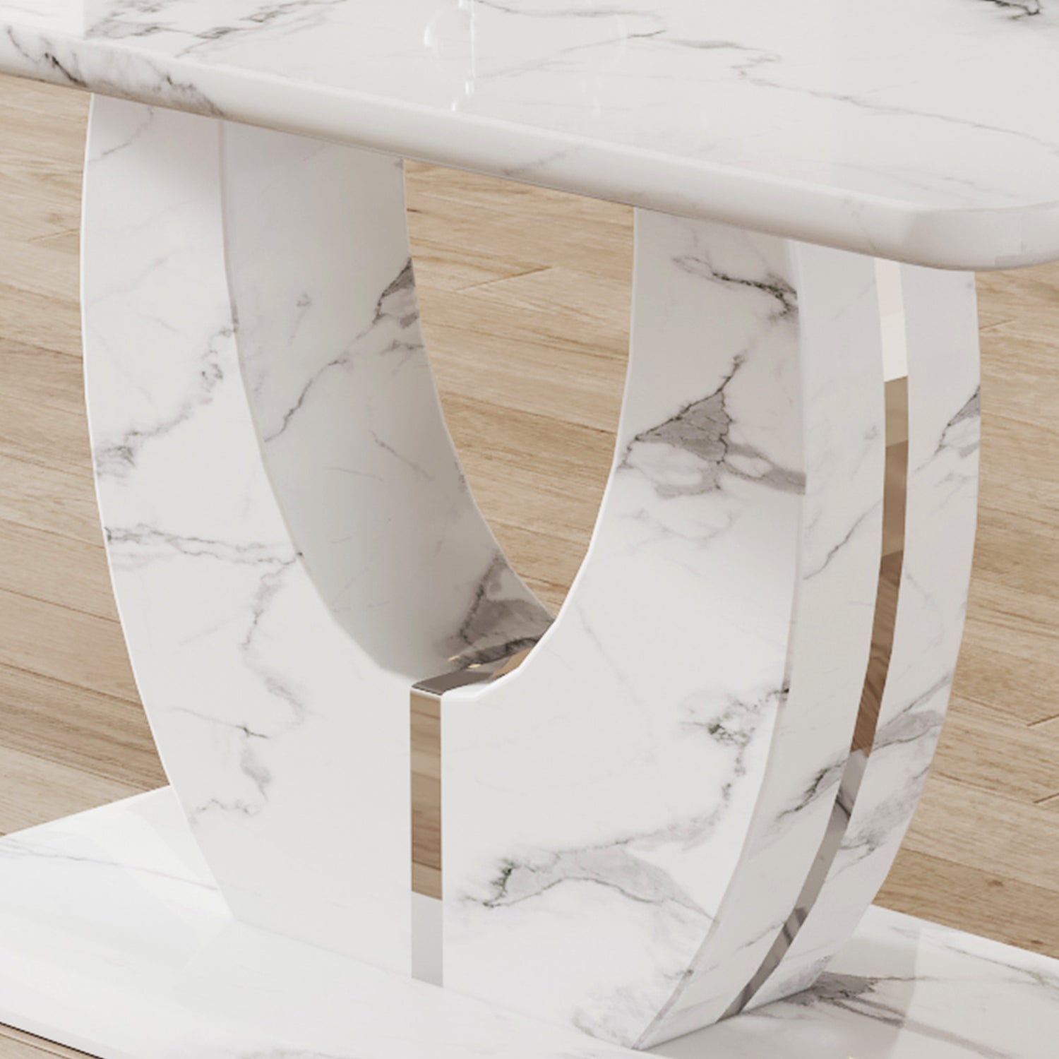 • Patas decoradas de acero inoxidable en forma de U: las patas en forma de U hechas de material MDF están adornadas con tiras decorativas plateadas de acero inoxidable, lo que agrega brillo y resistencia al desgaste.Diseño de base antideslizante: la base está hecha de material MDF con almohadillas antideslizantes, que protegen el piso y aumentan la estabilidad.