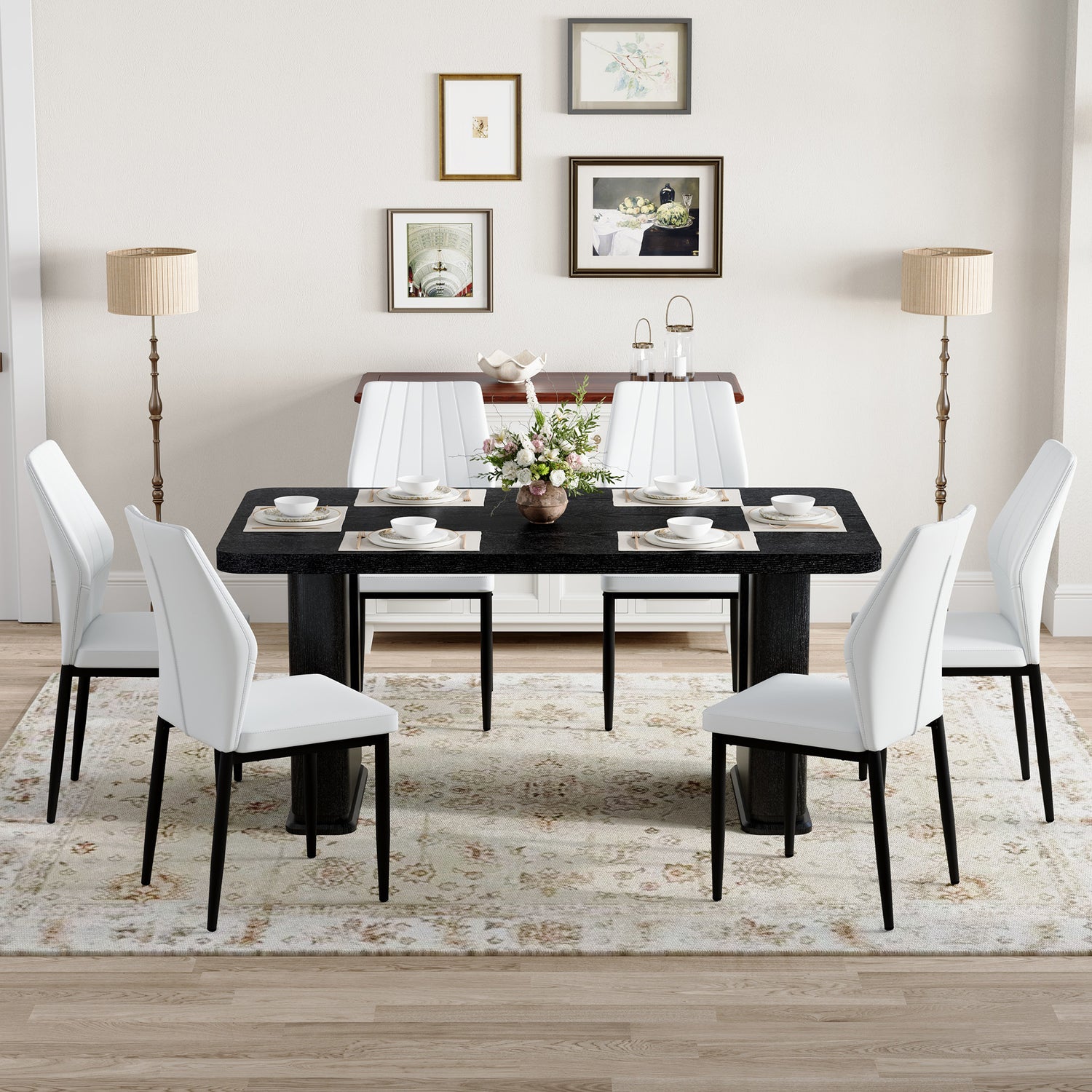 Juego de mesa y sillas. Elegante mesa de comedor de madera negra texturizada de 163 x 90 cm. Incluye 6 sillas de comedor de poliuretano blanco y negro con diseño de concha. Irradia un estilo moderno.
