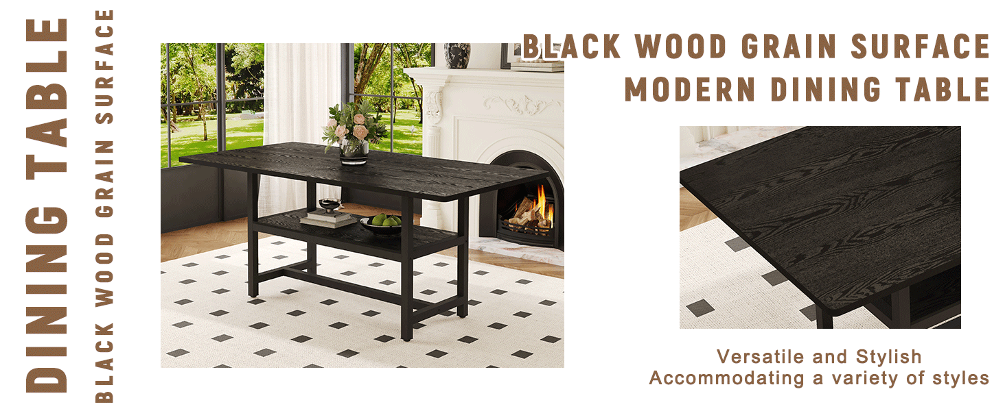 Juego de mesa y sillas. Mesa de comedor empalmada de grano negro de 71 x 35,4 pulgadas con función de almacenamiento en el medio de las patas de la mesa. Combina con 8 sillas de comedor de PU negras con respaldo ergonómico con hebilla. está agotado y se enviará tan pronto como vuelva a estar disponible.