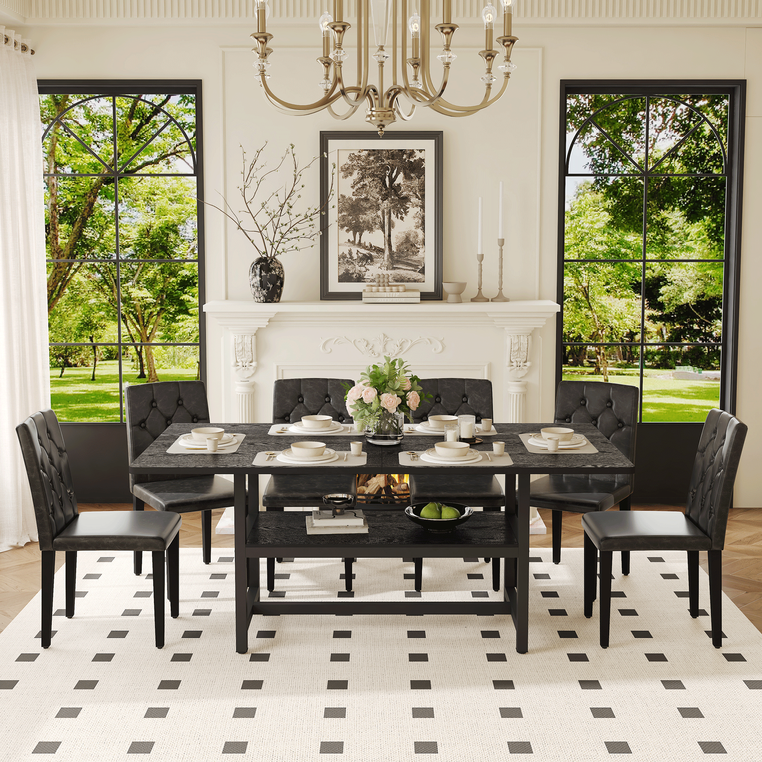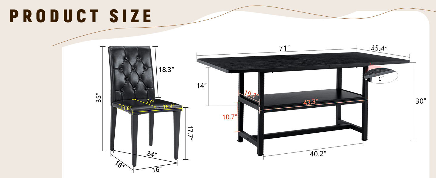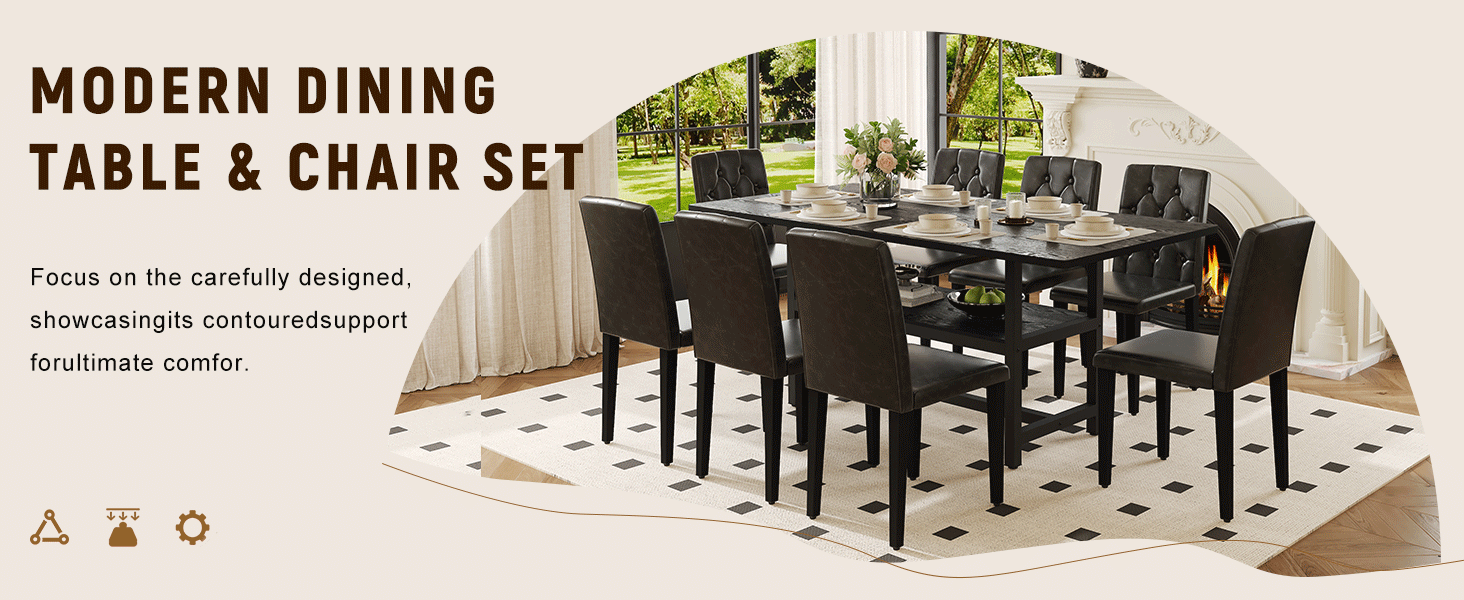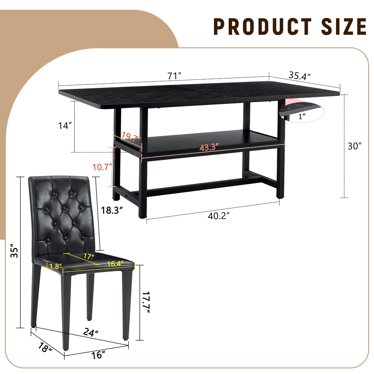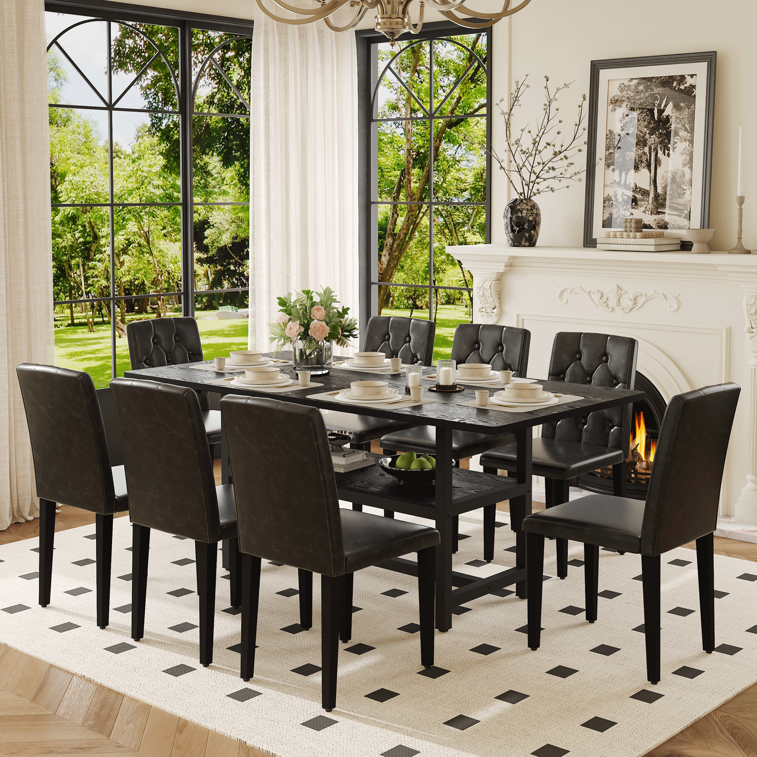 Juego de mesa y sillas. Mesa de comedor empalmada de grano negro de 71 x 35,4 pulgadas con función de almacenamiento en el medio de las patas de la mesa. Combina con 8 sillas de comedor de PU negras con respaldo ergonómico con hebilla.