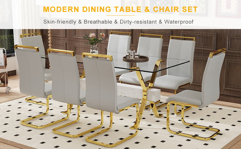 Juego de mesa y sillas. Elegante juego de comedor de vidrio templado transparente - 71'x35.4' con 8 sillas de PU gris claro con patas de metal de tubo en C dorado.