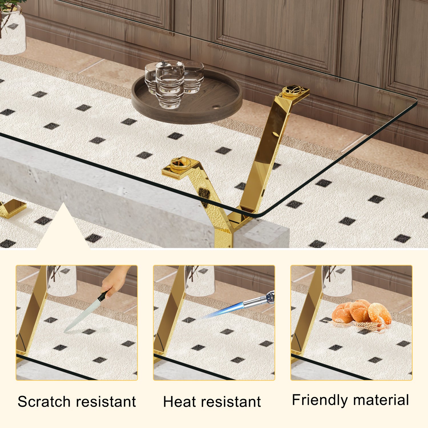 • Tablero de mesa de vidrio templado transparente: un tablero de mesa grande de 71'x35.4' hecho de vidrio templado transparente con bordes lisos, que garantiza una alta seguridad y puede acomodar cómodamente de 4 a 8 personas.