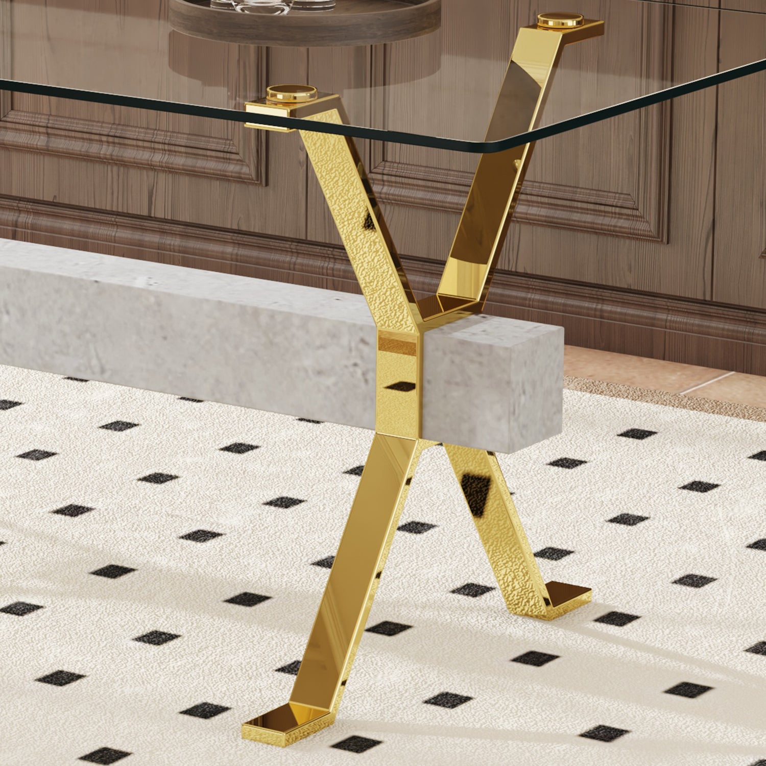 • Patas de metal dorado en forma de X: Dos patas de metal en forma de X con una viga transversal de MDF en el medio, cubiertas con pegatinas de grano gris claro, que agregan un soporte estable. Protección de pies antideslizante: Las patas están equipadas con pies antideslizantes, que protegen el piso y al mismo tiempo garantizan la estabilidad de la mesa del comedor.