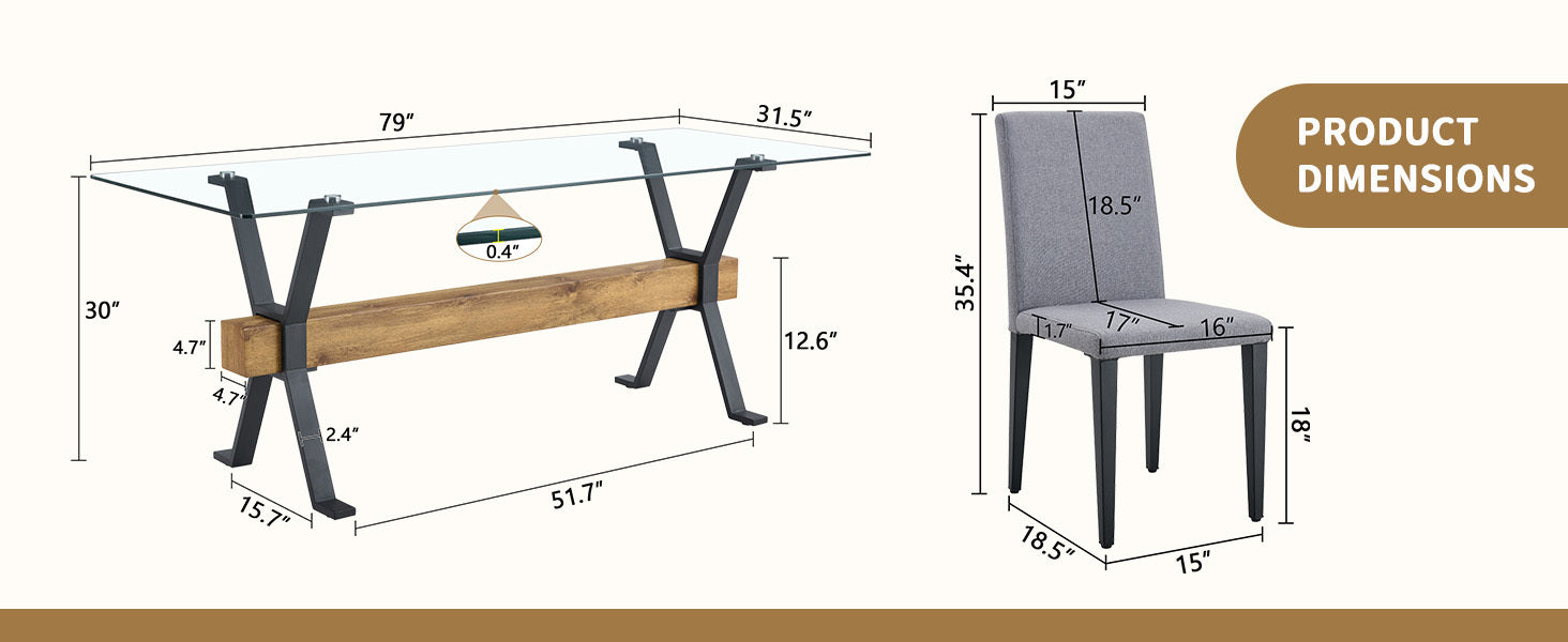Juego de mesa y sillas. Tablero de vidrio templado de 79'x31.5' pulgadas con patas de mesa de metal negro en forma de X, viga transversal de MDF con textura de veta de madera. Combina con 6 sillas de comedor de lino y algodón gris claro. - Por defecto está agotado y se enviará tan pronto como vuelva a estar disponible.