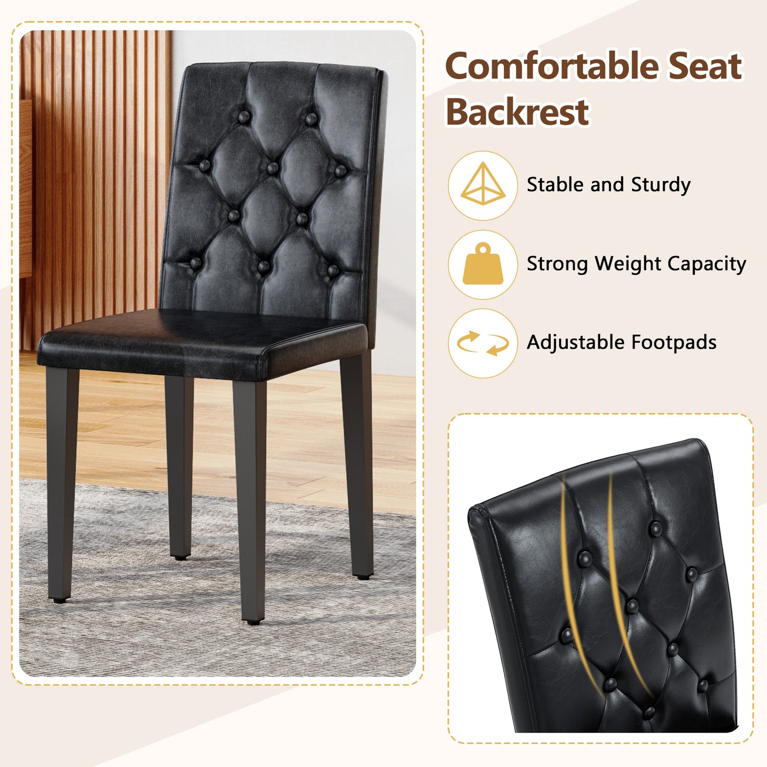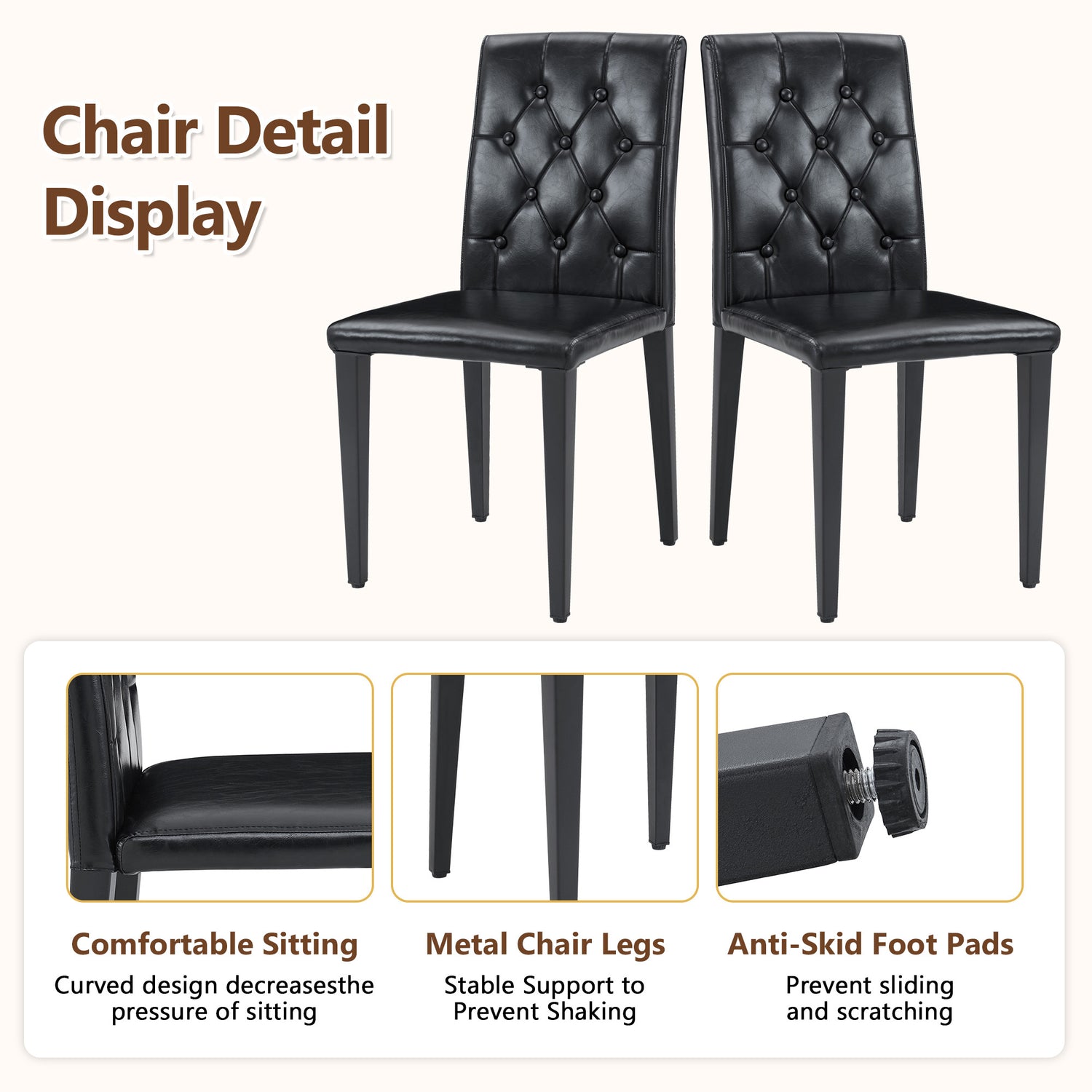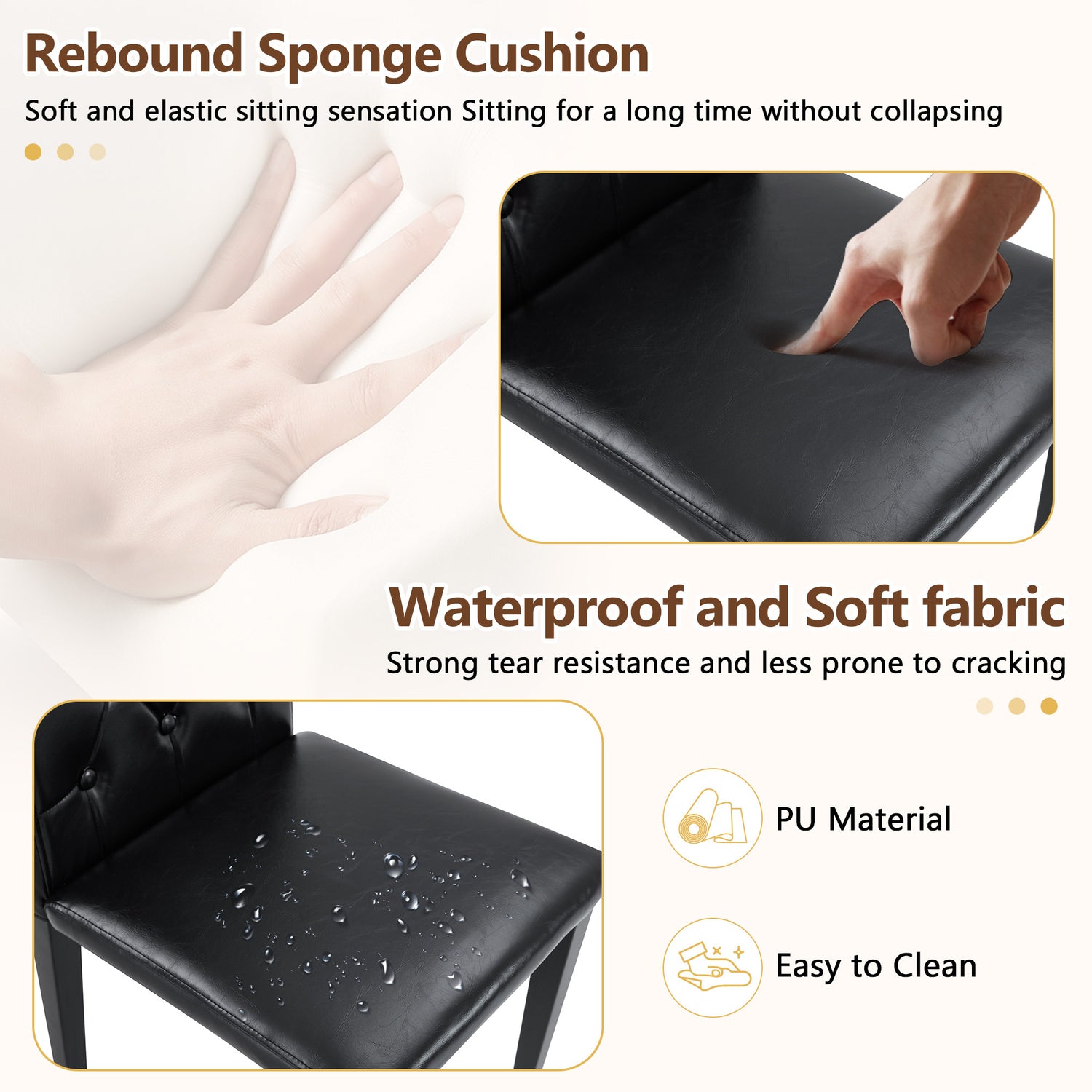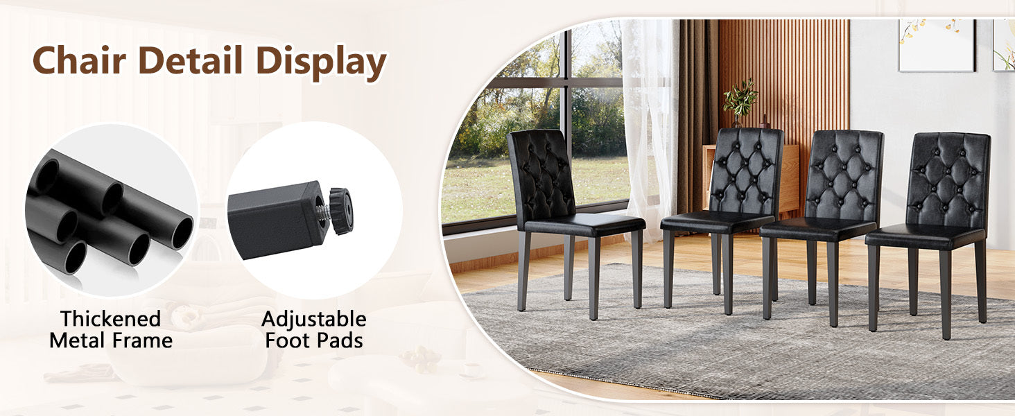 • Material de PU de alta calidad: El respaldo y el cojín del asiento están hechos de PU, que no solo tiene una apariencia delicada, sino que también es muy fácil de limpiar. Simplemente límpielo con un paño húmedo y detergente suave para mantener la silla de comedor como nueva.