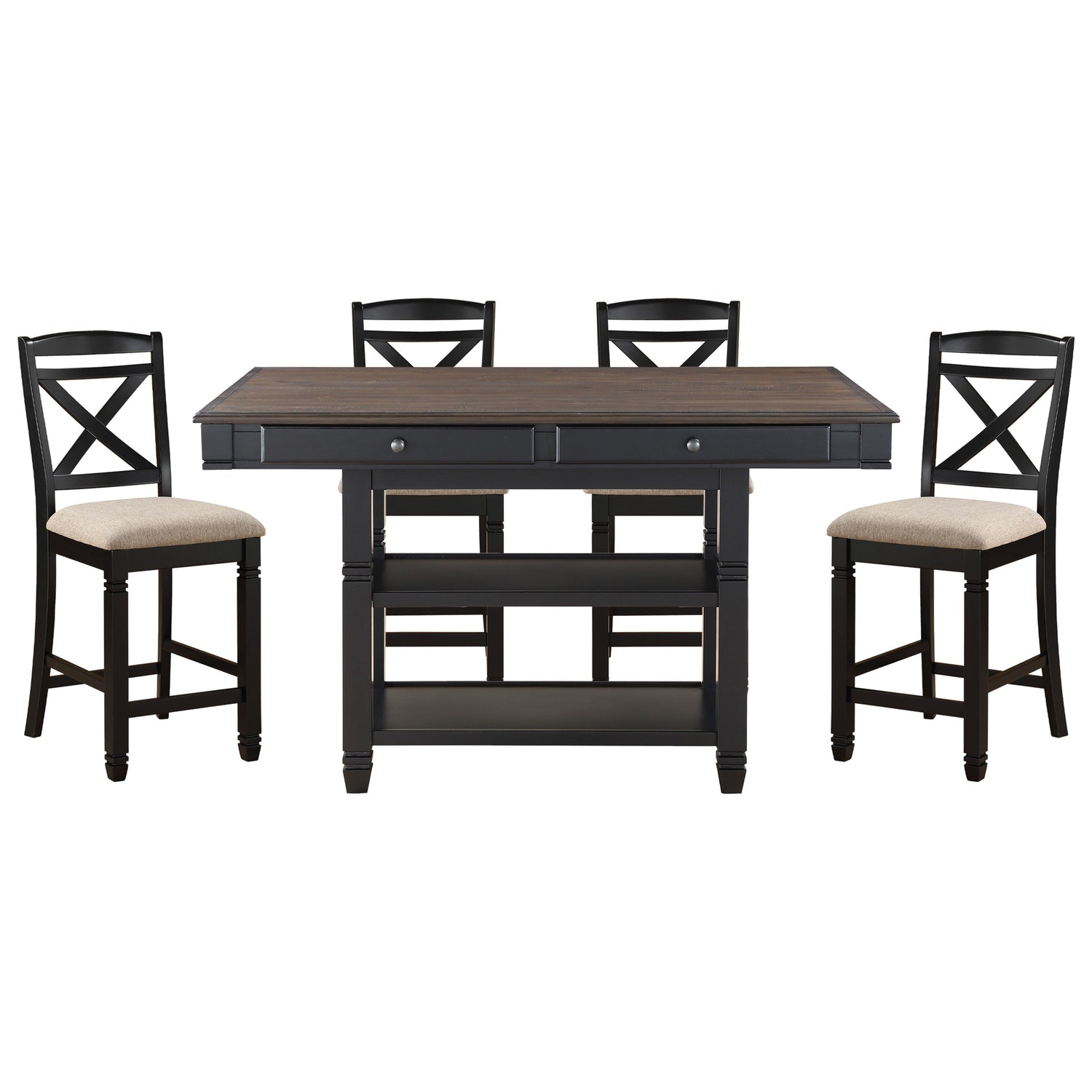 Juego de comedor de estilo transicional con altura de mostrador, mesa de 5 piezas con estantes de exhibición, cajones y 4 sillas de altura de mostrador, acabado negro.