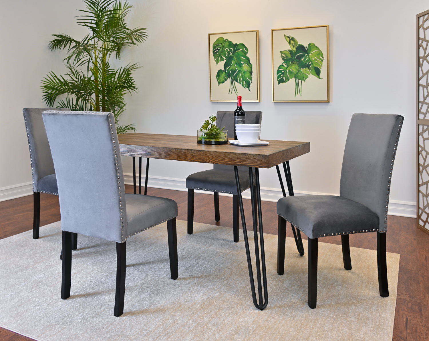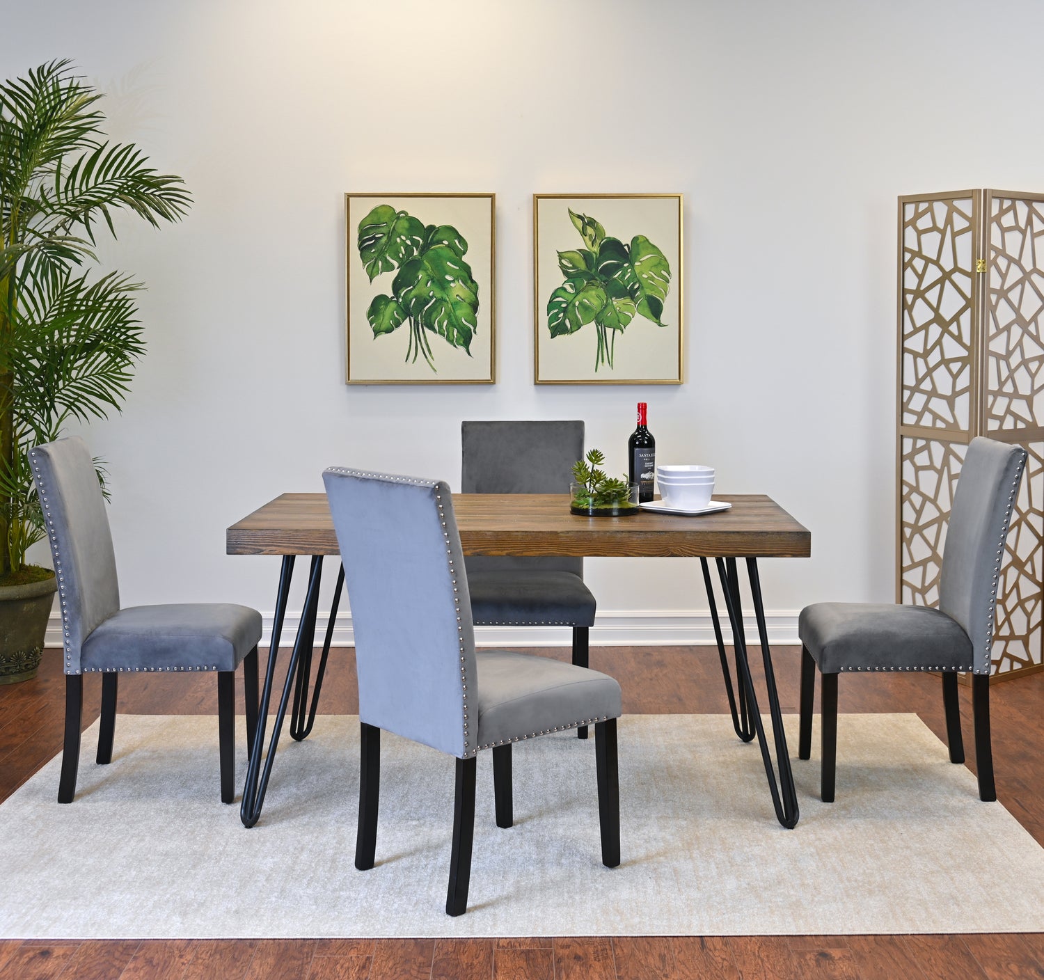 - CARACTERÍSTICAS DESTACADAS: La mesa de comedor presenta un diseño de horquilla metálica que le aporta estabilidad y estilo. Tiene un acabado rústico de pino oscuro y una textura de veta de madera natural, lo que le da un aspecto elegante. Las sillas presentan detalles de tachuelas cromadas que crean un llamativo contraste con la tapicería de terciopelo, realzando su atractivo visual.