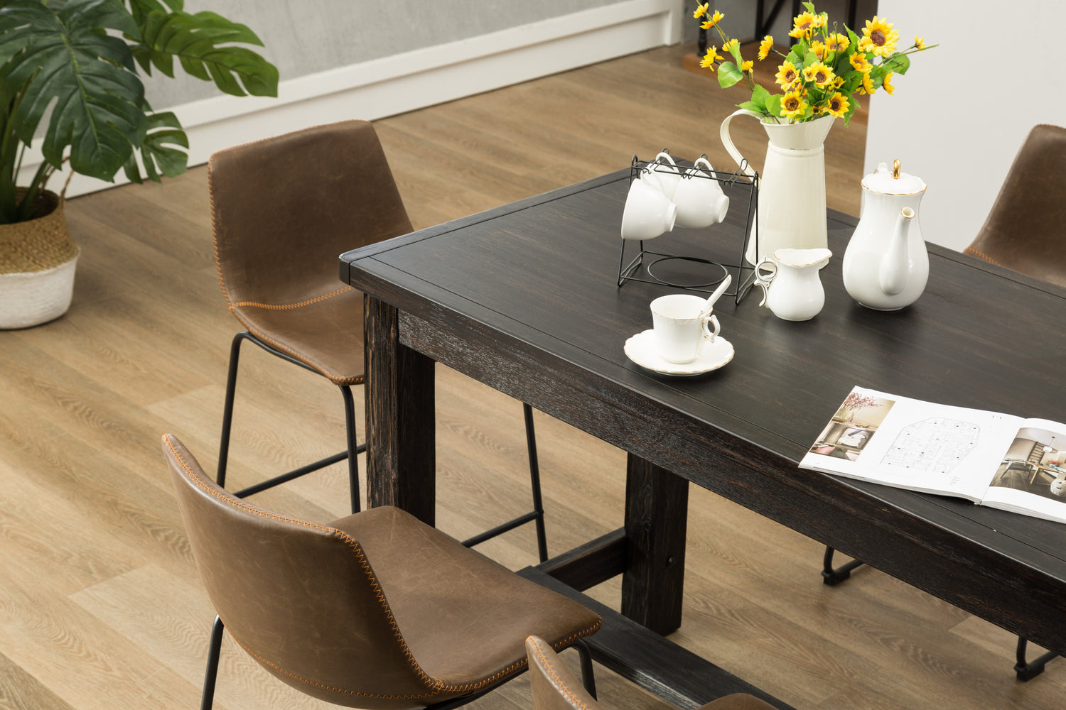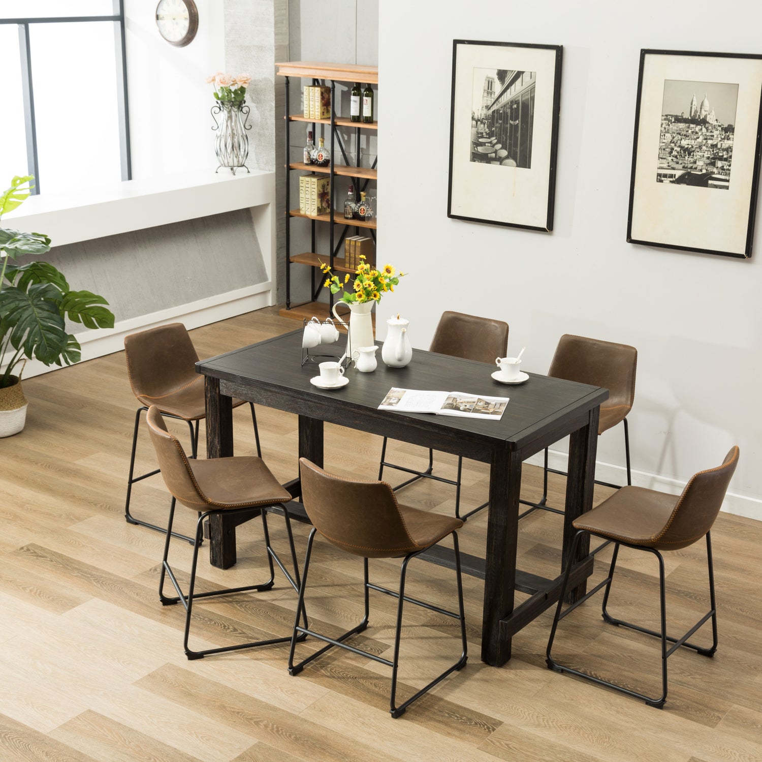 • El juego incluye una mesa y seis sillas altas. Las sillas de comedor están fabricadas en cuero sintético marrón y tienen una resistente estructura de metal con acabado cepillado, a juego con las finas costuras.