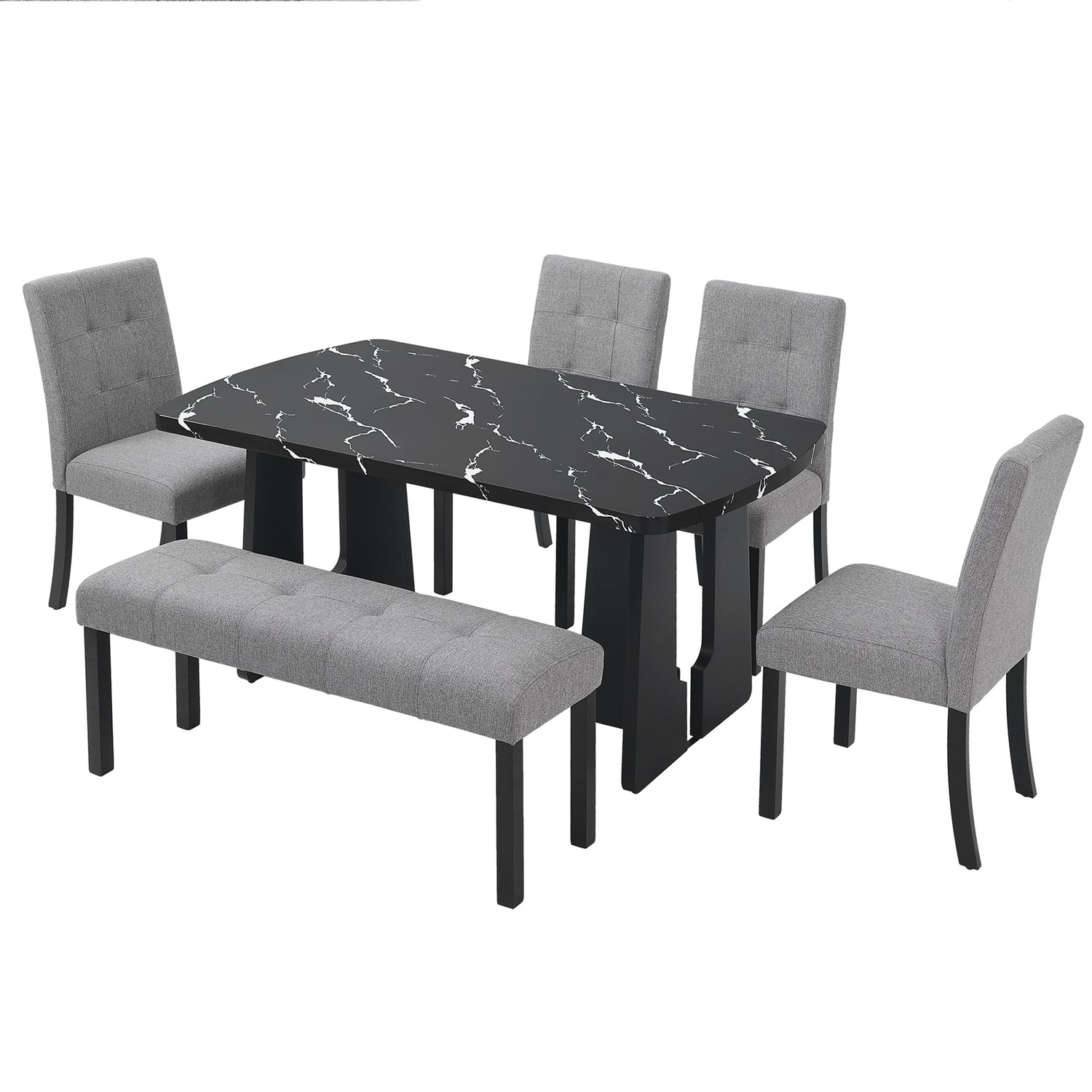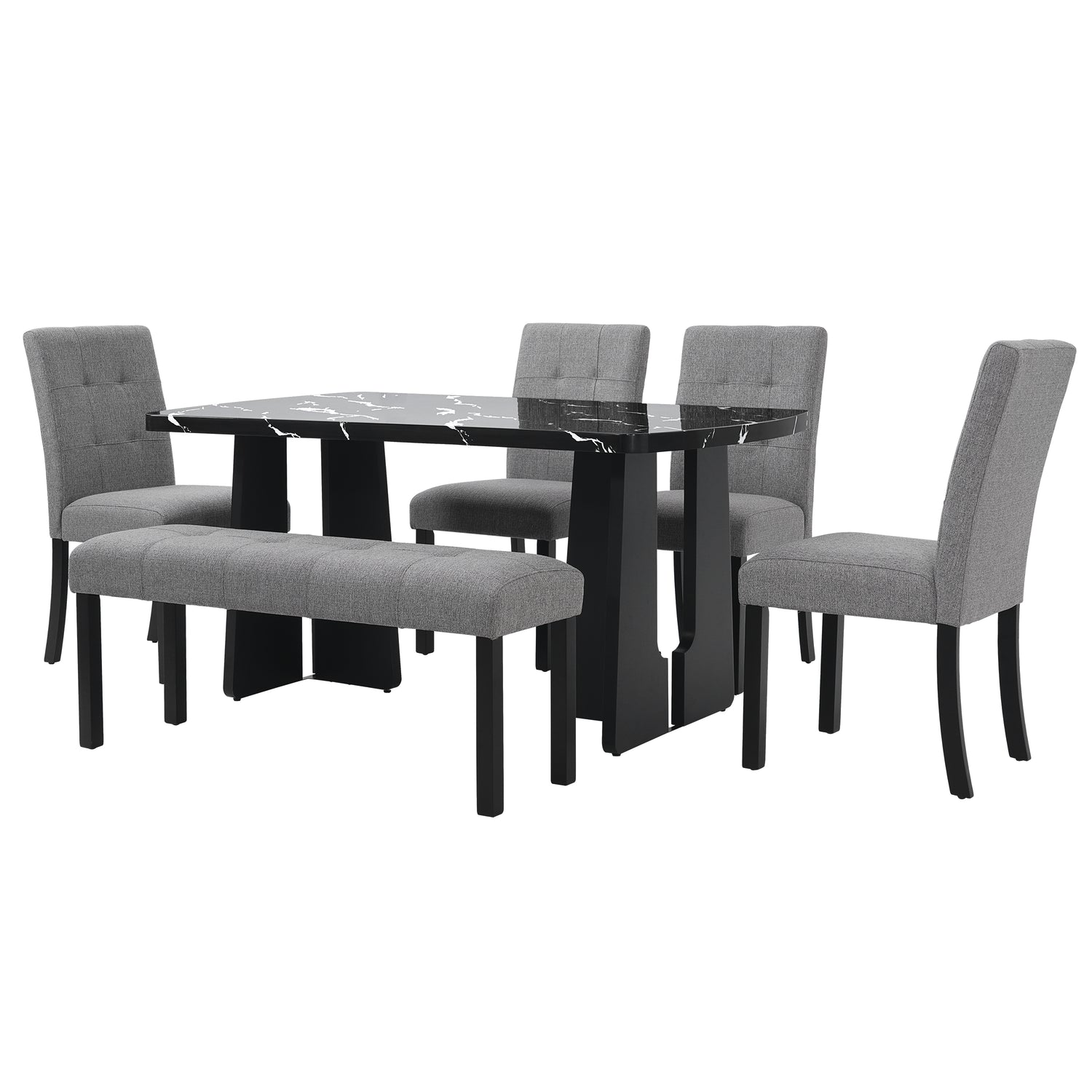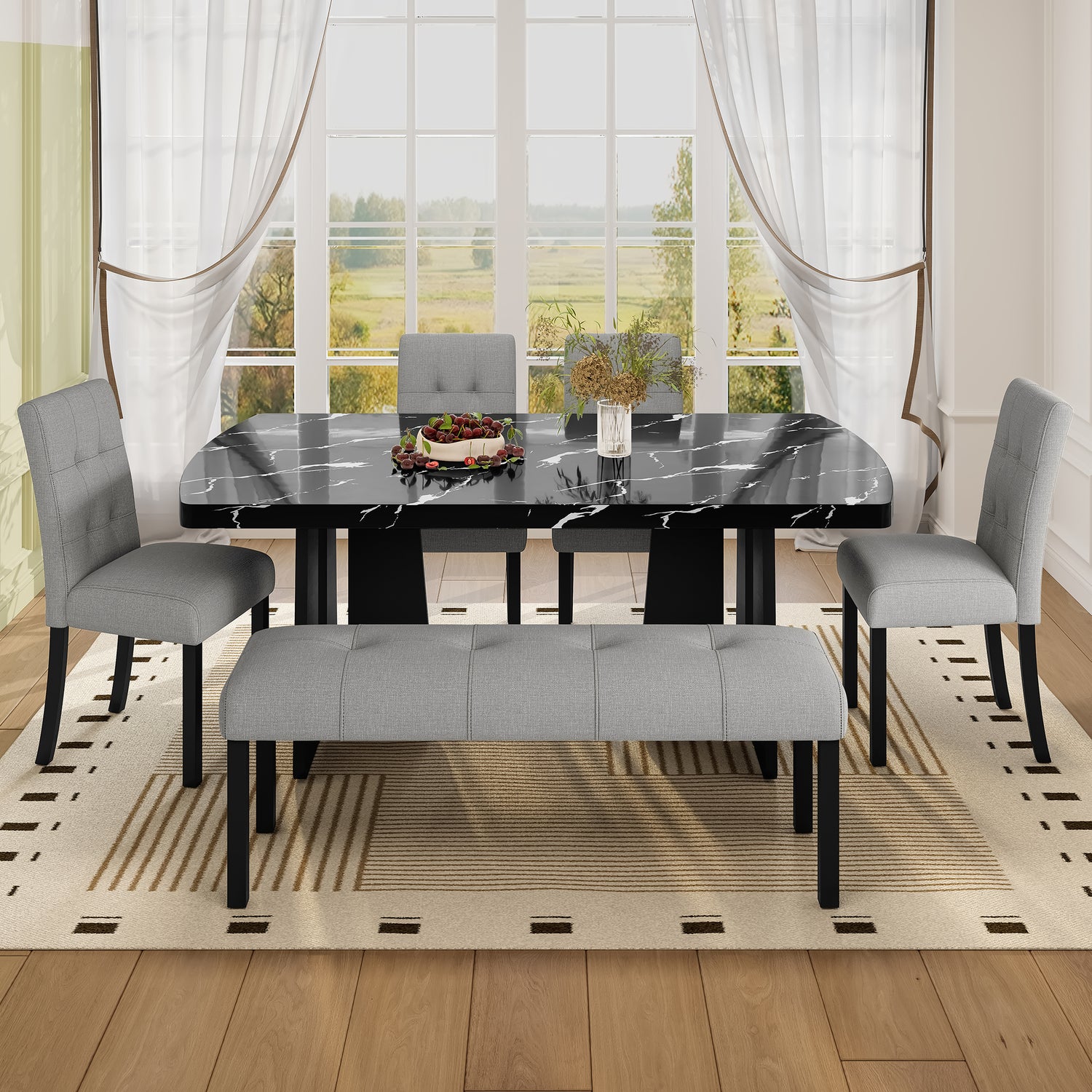 Juego de mesa de comedor moderna de 6 piezas, mesa de comedor de 16 m de imitación de mármol con patas geométricas, 4 sillas tapizadas y 1 banco, ideal para comedor o cocina, fácil de montar, color negro y gris.