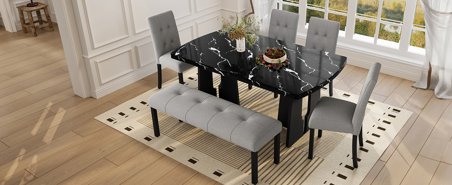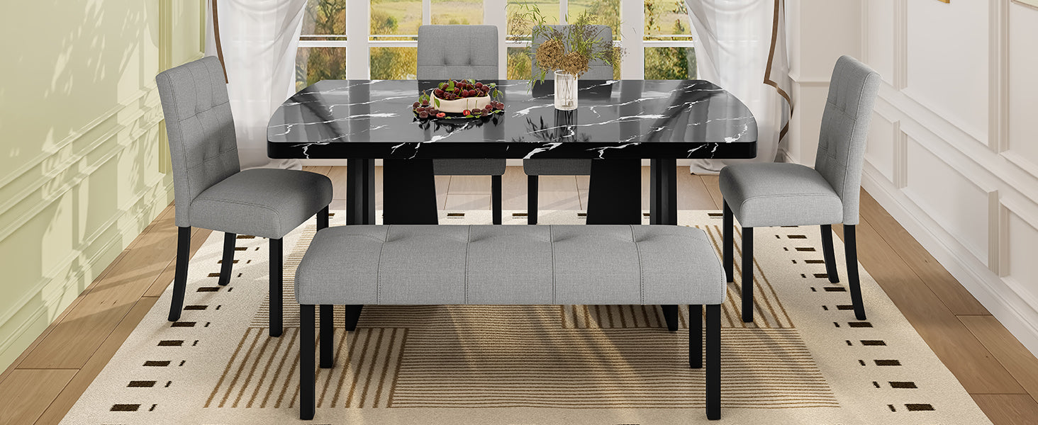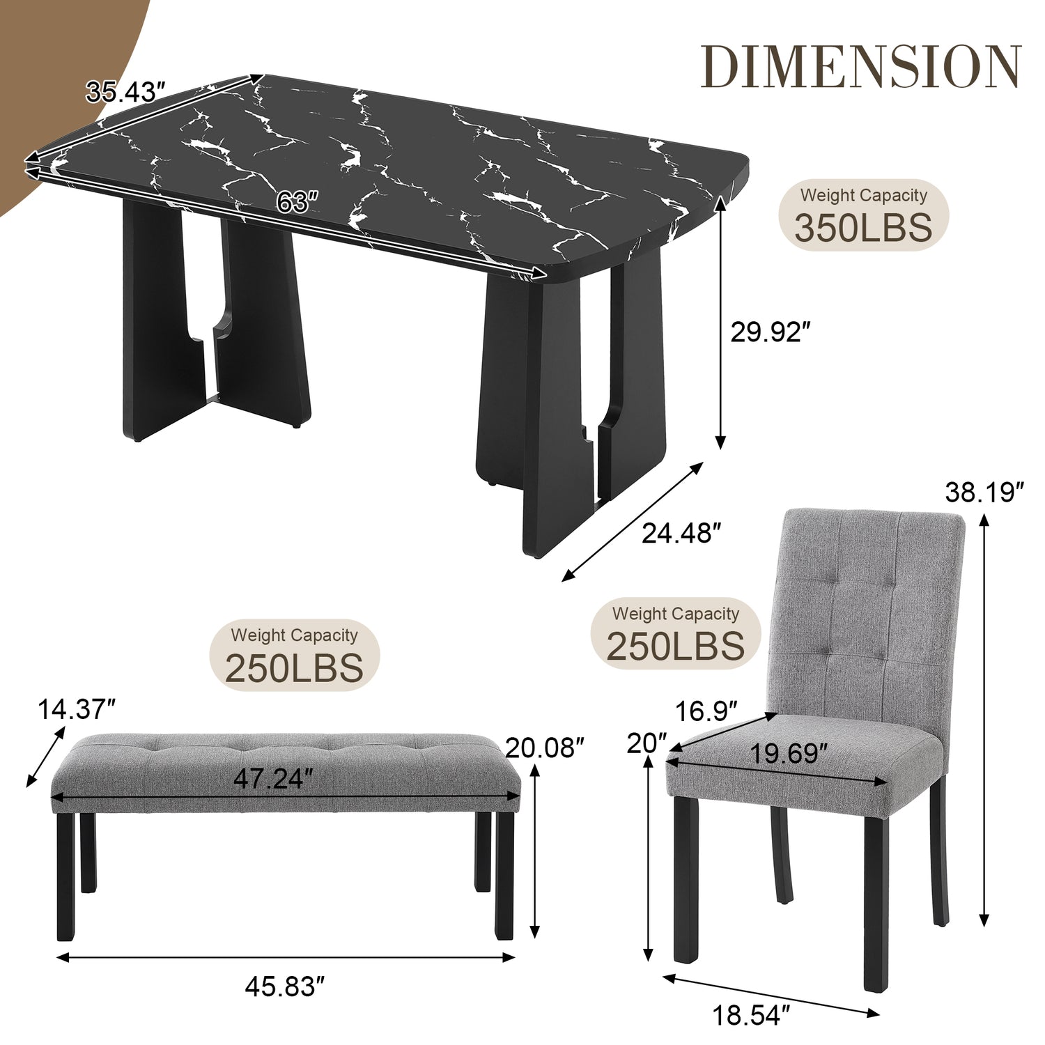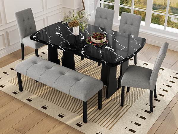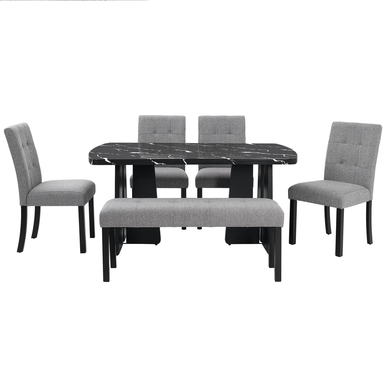 Juego de mesa de comedor moderna de 6 piezas, mesa de comedor de 16 m de imitación de mármol con patas geométricas, 4 sillas tapizadas y 1 banco, ideal para comedor o cocina, fácil de montar, color negro y gris.