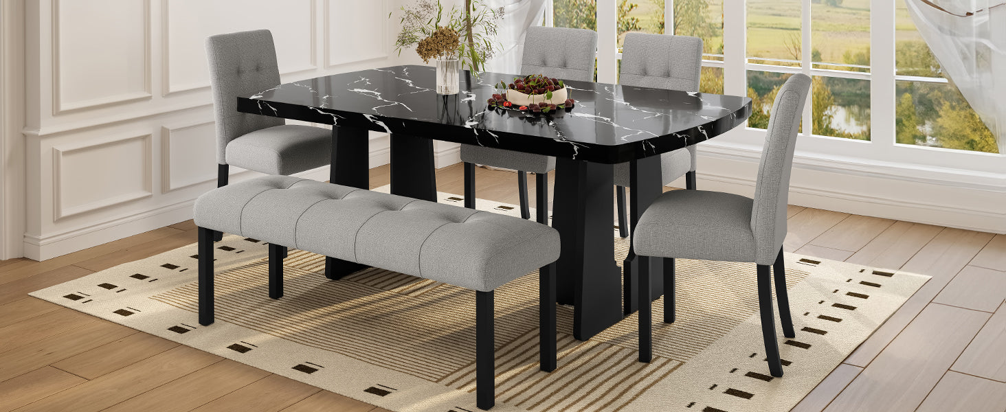 - Material de primera calidad: La mesa de comedor cuenta con un tablero de imitación mármol con núcleo de MDF, que ofrece la lujosa apariencia del mármol natural, además de ser resistente a arañazos, manchas y calor. Las patas de la mesa, las patas de las sillas y las patas del banco están fabricadas con madera de caucho. Esta combinación de materiales no solo garantiza durabilidad, sino que también facilita el mantenimiento del conjunto: simplemente limpie la superficie de imitación mármol y limpie las patas de madera de caucho para una apariencia renovada.
