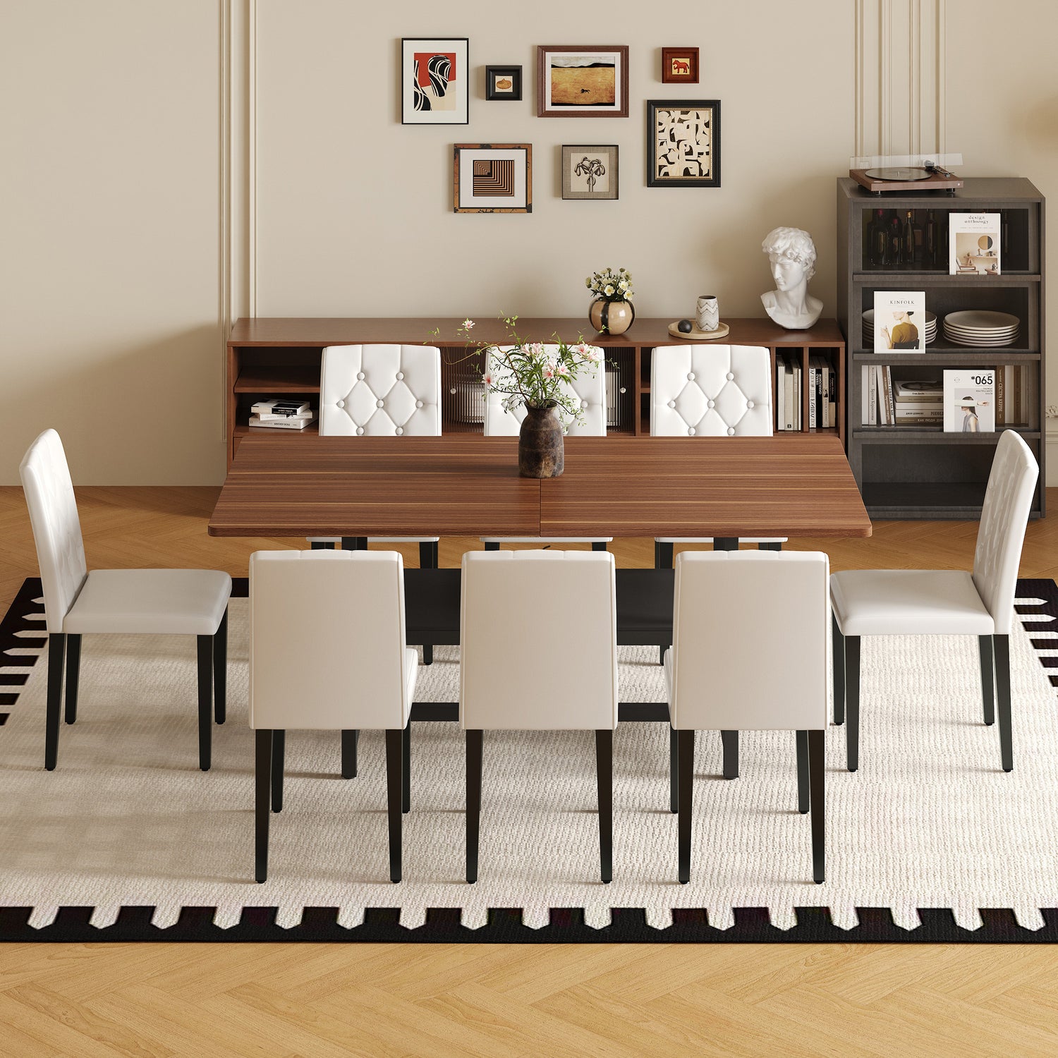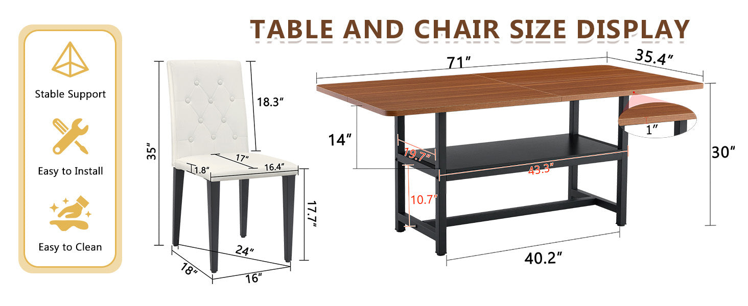 Juego de mesa y sillas. Mesa de comedor empalmada de grano de nogal de 71 x 35,4 pulgadas con función de almacenamiento en el medio de las patas de la mesa. Combina con 8 sillas de comedor de PU blancas con respaldo ergonómico con hebilla.
