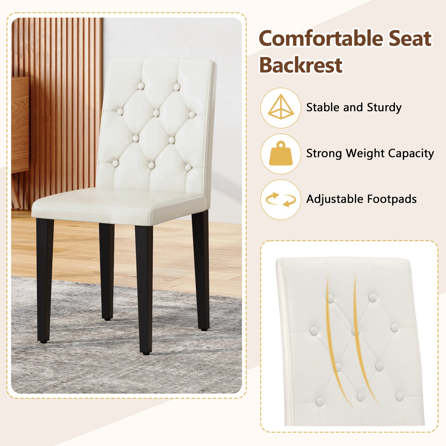 - Material de PU de alta calidad: El respaldo y el cojín del asiento están hechos de PU, que no solo tiene una apariencia delicada, sino que también es muy fácil de limpiar. Simplemente límpielo con un paño húmedo y detergente suave para mantener la silla de comedor como nueva.