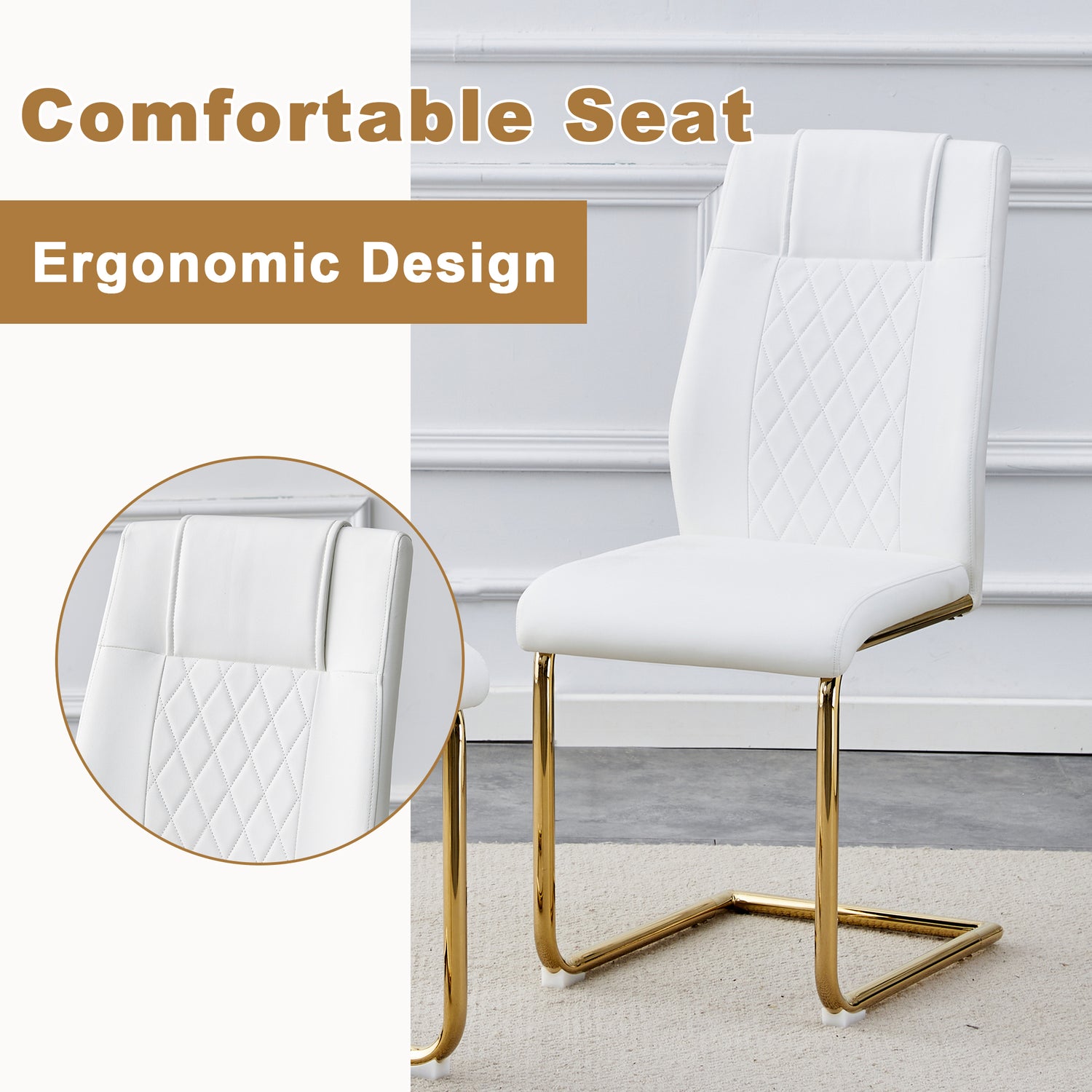Juego de mesa y sillas. 71'x35.4'x30' Lujosa mesa de comedor de vidrio con diseño Pandora y patas de MDF en forma de C doradas espalda con espalda. Combina con 8 sillas de PU blancas de alta calidad con patas de metal arqueadas.