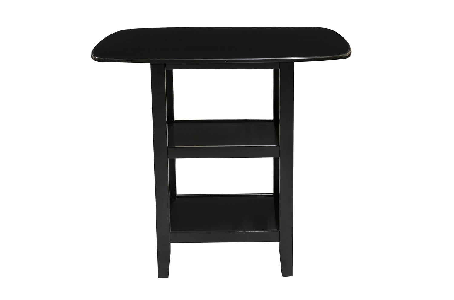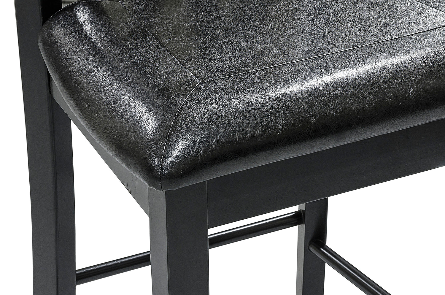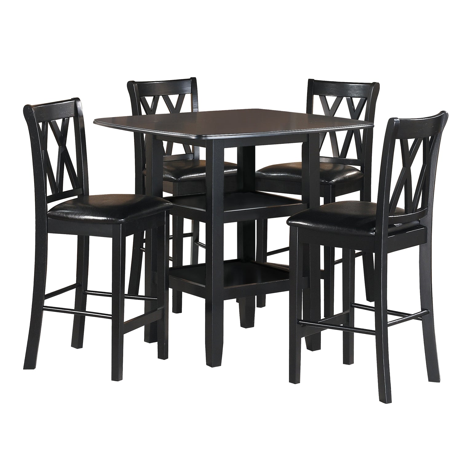 Juego de comedor de 5 piezas con altura de mostrador y acabado negro, con estantes inferiores y 4 sillas, tapizado en piel sintética.