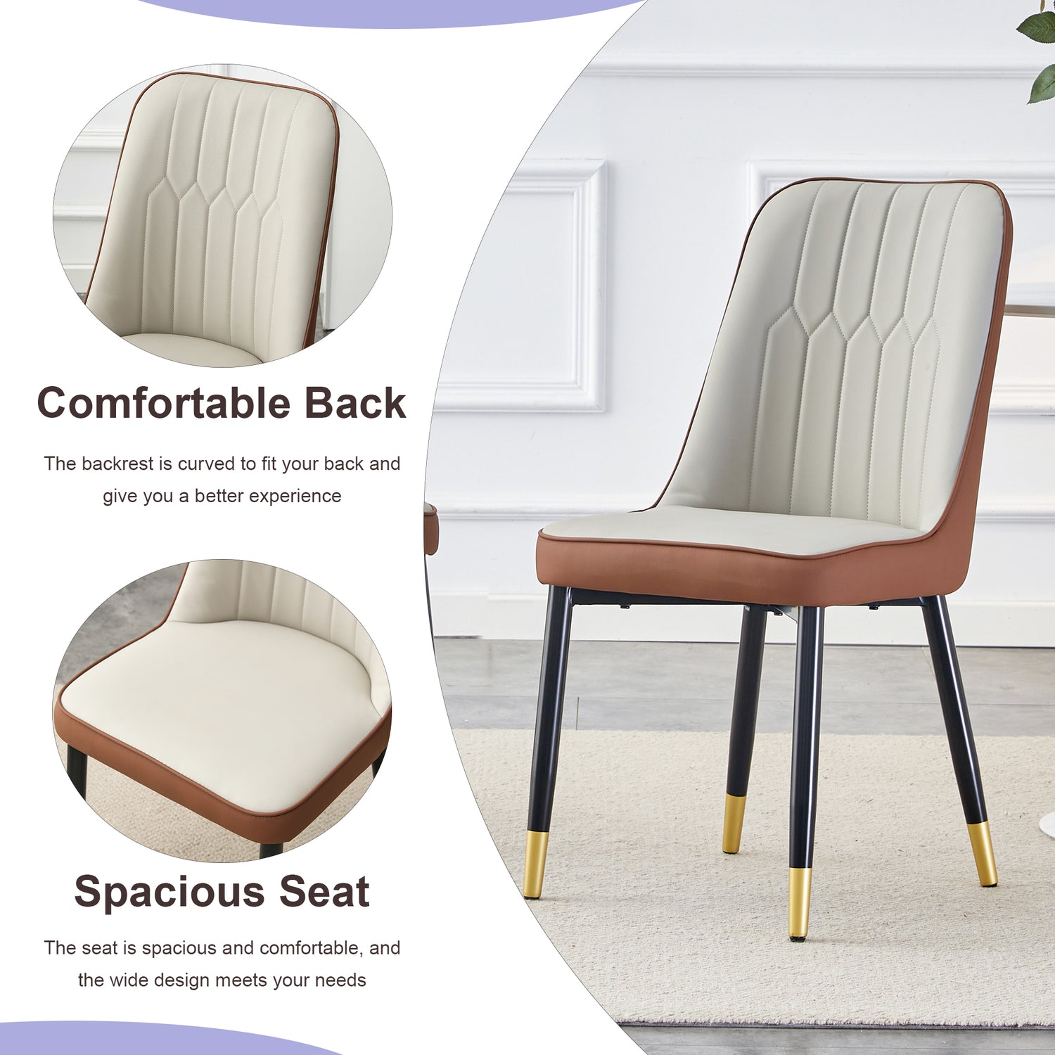 - Decoración en aerosol dorado: la parte inferior de las patas de la silla cerca del suelo está decorada con aerosol dorado, lo que agrega un toque de lujo al diseño.Patas de piso antideslizantes: teniendo en cuenta la seguridad y la estabilidad de uso, la parte inferior de las patas de la silla está especialmente equipada con patas de piso antideslizantes, protegiendo el piso y asegurando la estabilidad de las sillas de comedor durante el uso.