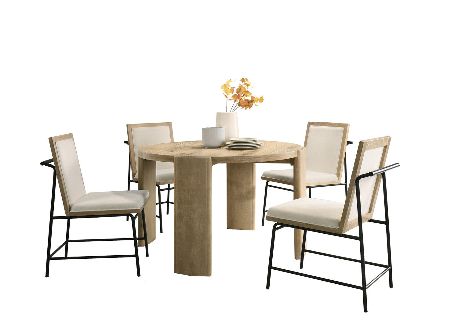 Juego de mesa de comedor redonda de 13,5 m con acabado en roble Bowen y sillas tapizadas en color crema