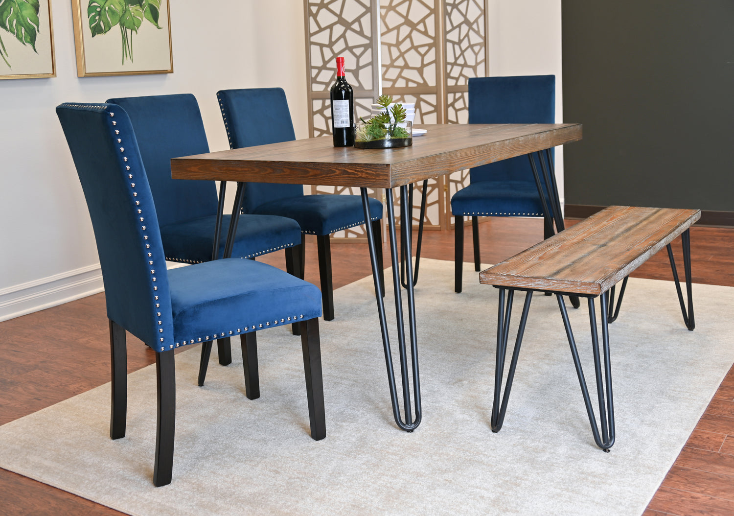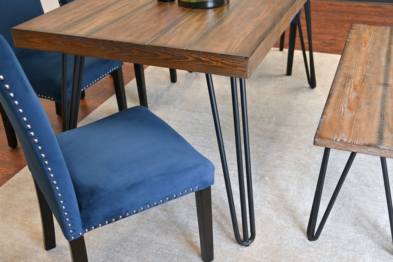 - CARACTERÍSTICAS DESTACADAS: La mesa de comedor presenta un diseño de horquilla metálica que le aporta estabilidad y estilo. Tiene un acabado rústico de pino oscuro y una textura de veta de madera natural, lo que le da un aspecto elegante. Las sillas presentan detalles de tachuelas cromadas que crean un llamativo contraste con la tapicería de terciopelo, realzando su atractivo visual.