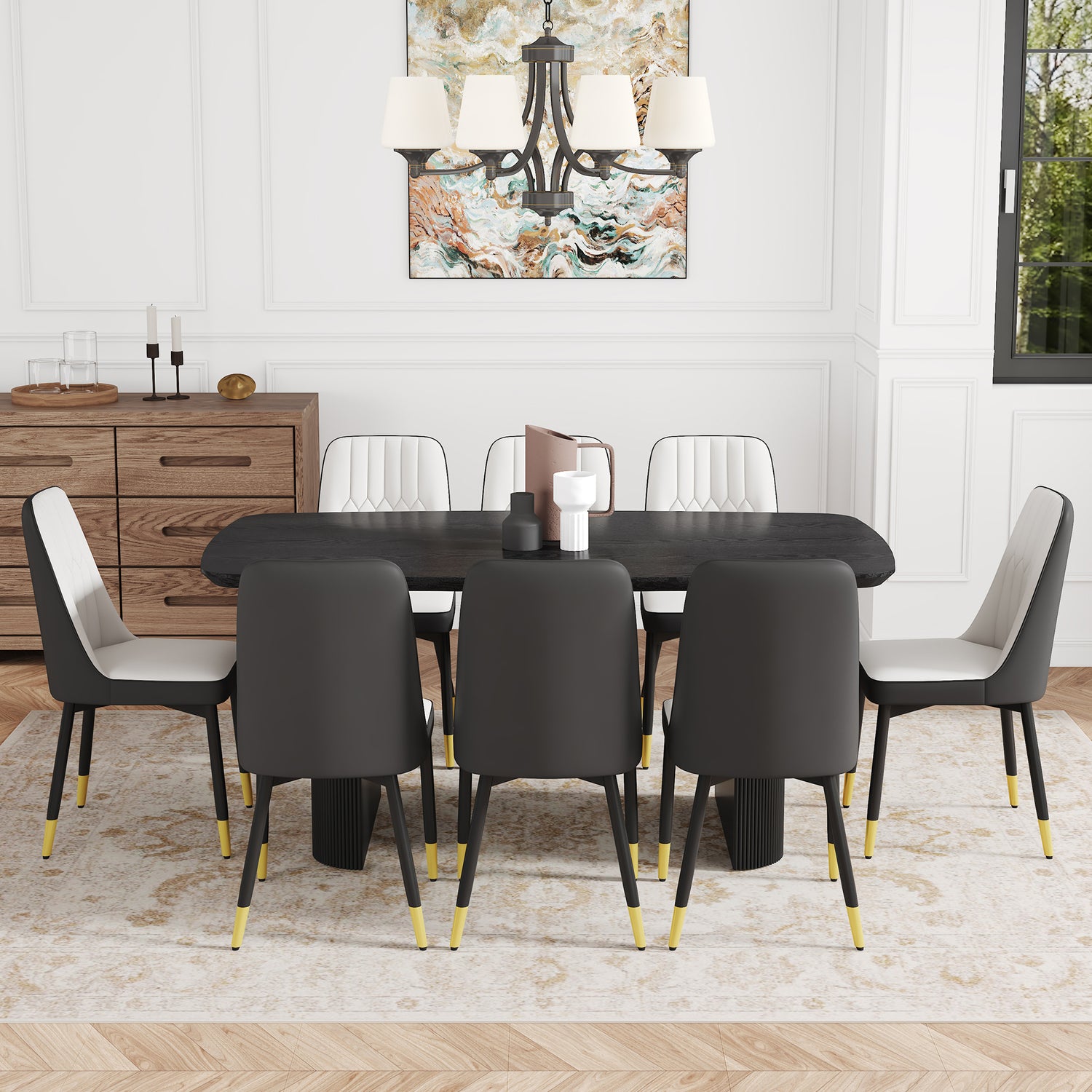 Juego de mesa y sillas. Mesa de comedor de MDF con veta de madera negra de 67 x 35,4 pulgadas: una opción simple, lujosa y estable. Combina con 8 sillas de color blanco y gris oscuro empalmadas con cojines de PU y patas de metal negro.