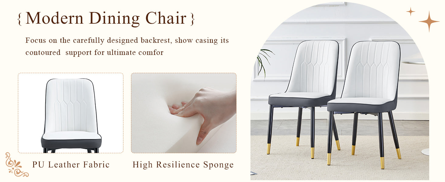 - Decoración en aerosol dorado: la parte inferior de las patas de la silla cerca del suelo está decorada con aerosol dorado, lo que agrega un toque de lujo al diseño.Patas de piso antideslizantes: teniendo en cuenta la seguridad y la estabilidad de uso, la parte inferior de las patas de la silla está especialmente equipada con patas de piso antideslizantes, protegiendo el piso y asegurando la estabilidad de las sillas de comedor durante el uso.