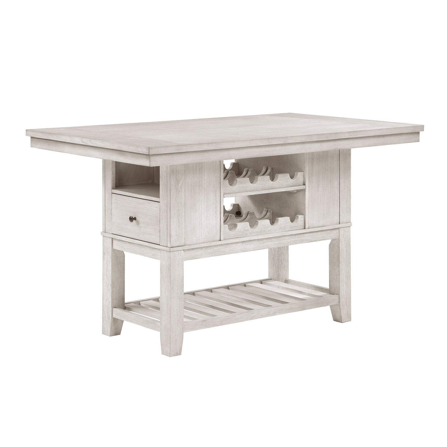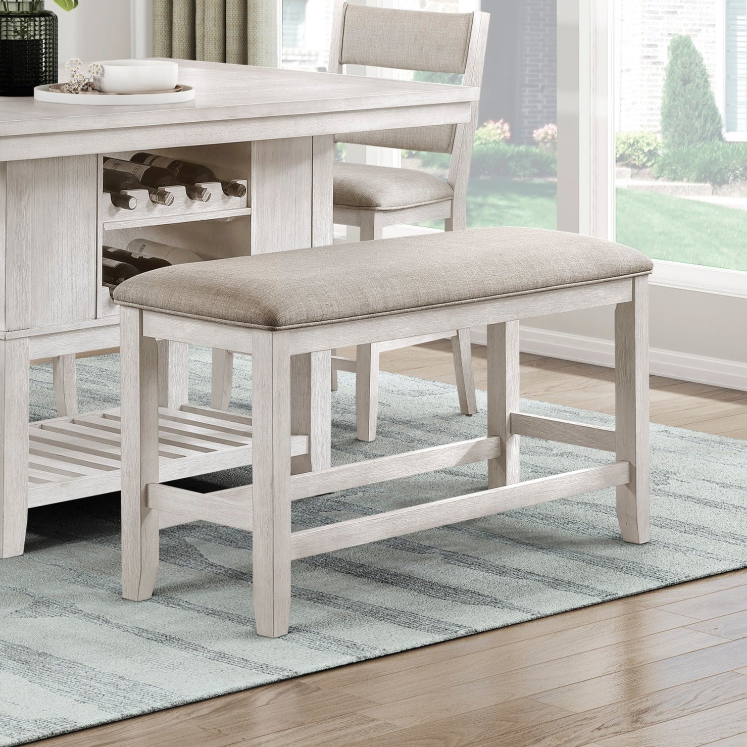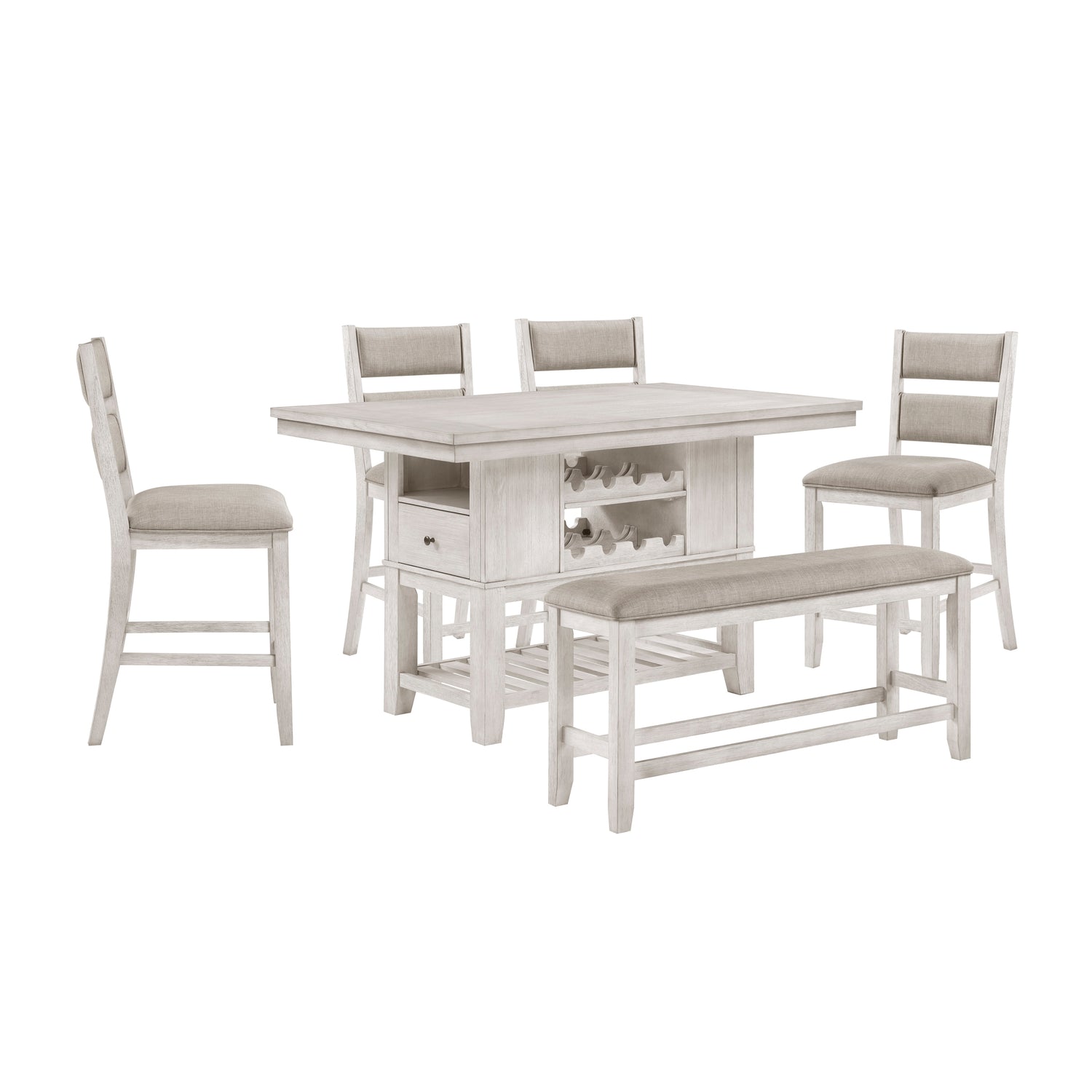 Juego de comedor de 6 piezas de altura de mostrador con mesa de acabado blanco antiguo con cajones de almacenamiento, estantes para vinos, banco, 4 sillas y asiento tapizado.