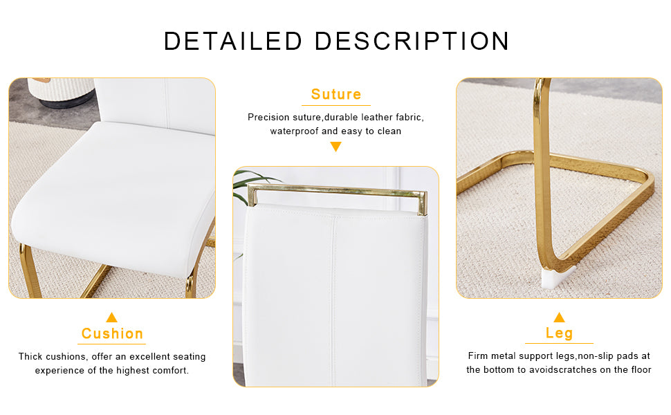 - Patas de metal arqueadas estables: las patas de metal arqueadas doradas no solo agregan una sensación de diseño, sino que también brindan un soporte fuerte, lo que garantiza la estabilidad y durabilidad de la silla. Manteniendo la seguridad del asiento durante el uso. Pies protectores antideslizantes: el diseño de pies antideslizantes en la parte inferior de las patas de la silla protege el piso de rayones y aumenta la seguridad de la silla durante su uso.