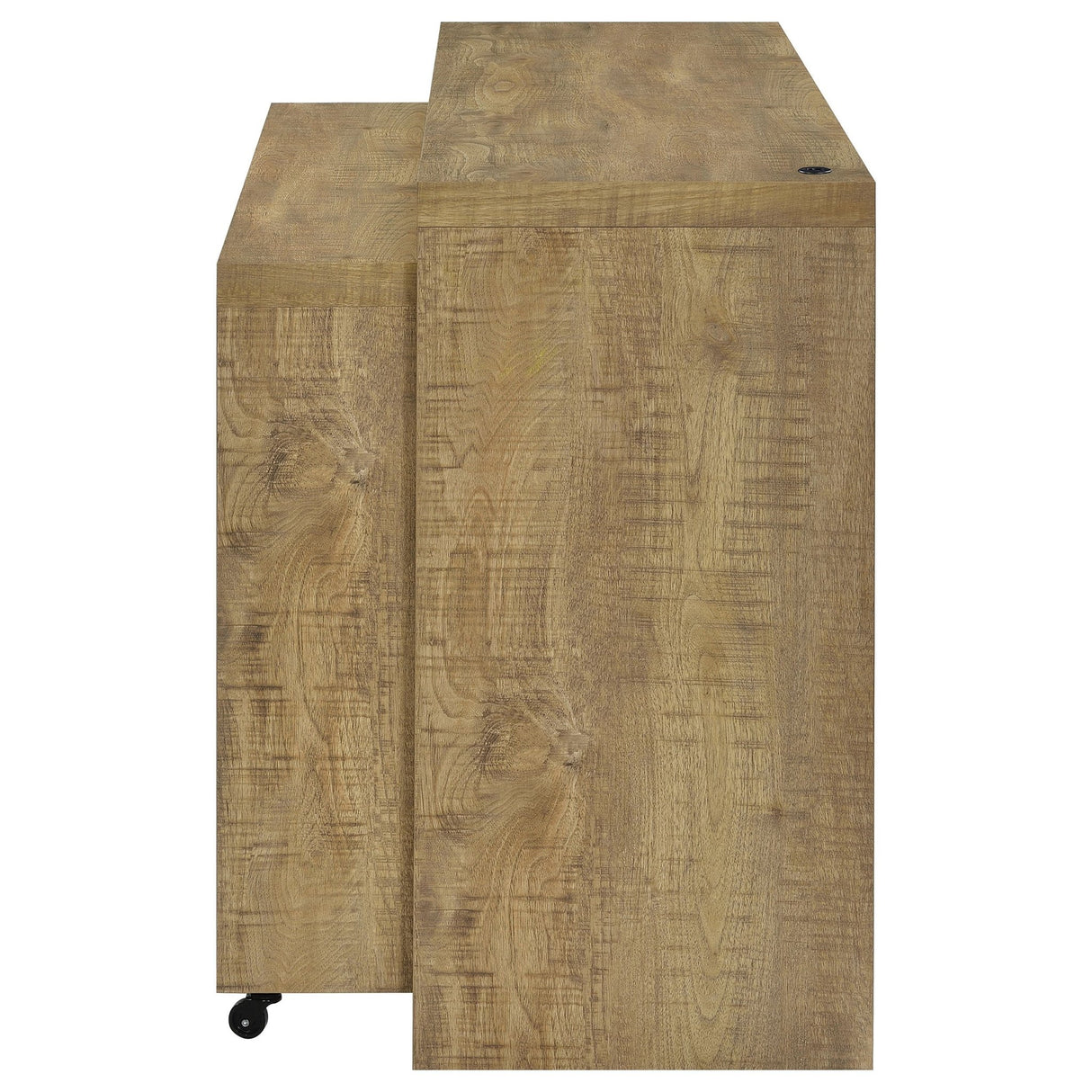 El juego de comedor multiusos definitivo: este moderno juego de comedor de cuatro piezas con altura de mostrador incluye dos mesas nido y dos taburetes sin respaldo. Su diseño fresco y contemporáneo presenta líneas limpias con un acabado en madera de mango de gran riqueza y naturalidad. La mesa grande es fija, mientras que la pequeña tiene ruedas, lo que le permite crear la configuración que mejor se adapte a su espacio y actividades, ya sea para cenar, trabajar desde casa o servir bebidas a familiares y amigos. Los dos taburetes a juego no tienen respaldo para guardarse debajo y presentan un acabado negro con cuero sintético negro y asientos acolchados. La mesa grande incluso cuenta con un puerto USB que facilita la carga de su teléfono u otros dispositivos electrónicos pequeños.